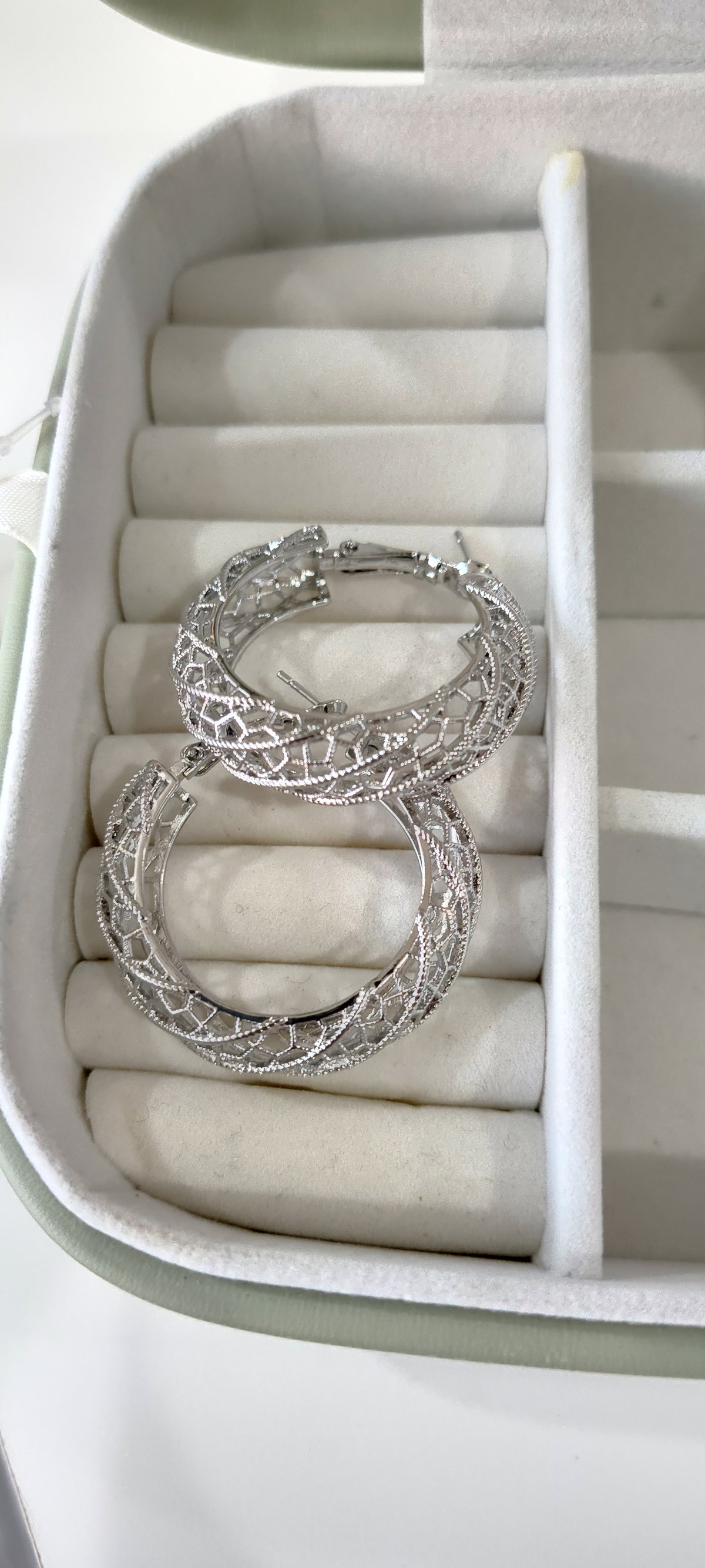 Argollas AQ Caladas combinan un diseño sofisticado con la resistencia del acero quirúrgico. Su estructura cuenta con delicados calados geométricos que aportan ligereza visual y un toque distintivo de elegancia.