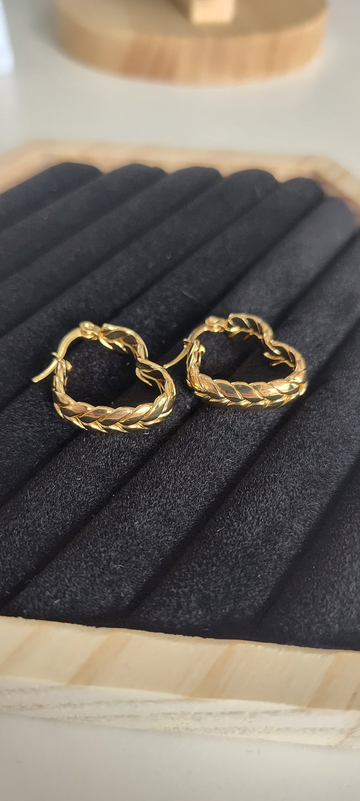 Estos aros en forma de corazón destacan por su diseño trabajado con un delicado labrado trenzado, que les aporta textura y brillo desde todos los ángulos. Su acabado dorado les da un aire elegante y sofisticado, mientras que la forma de corazón suma un toque romántico y femenino.