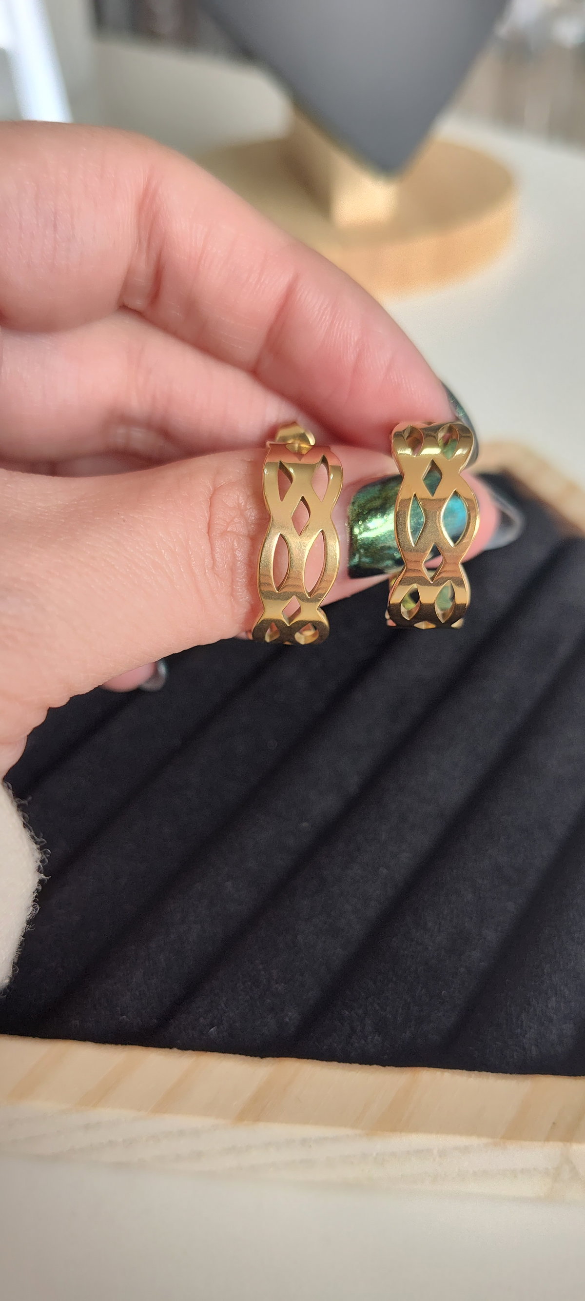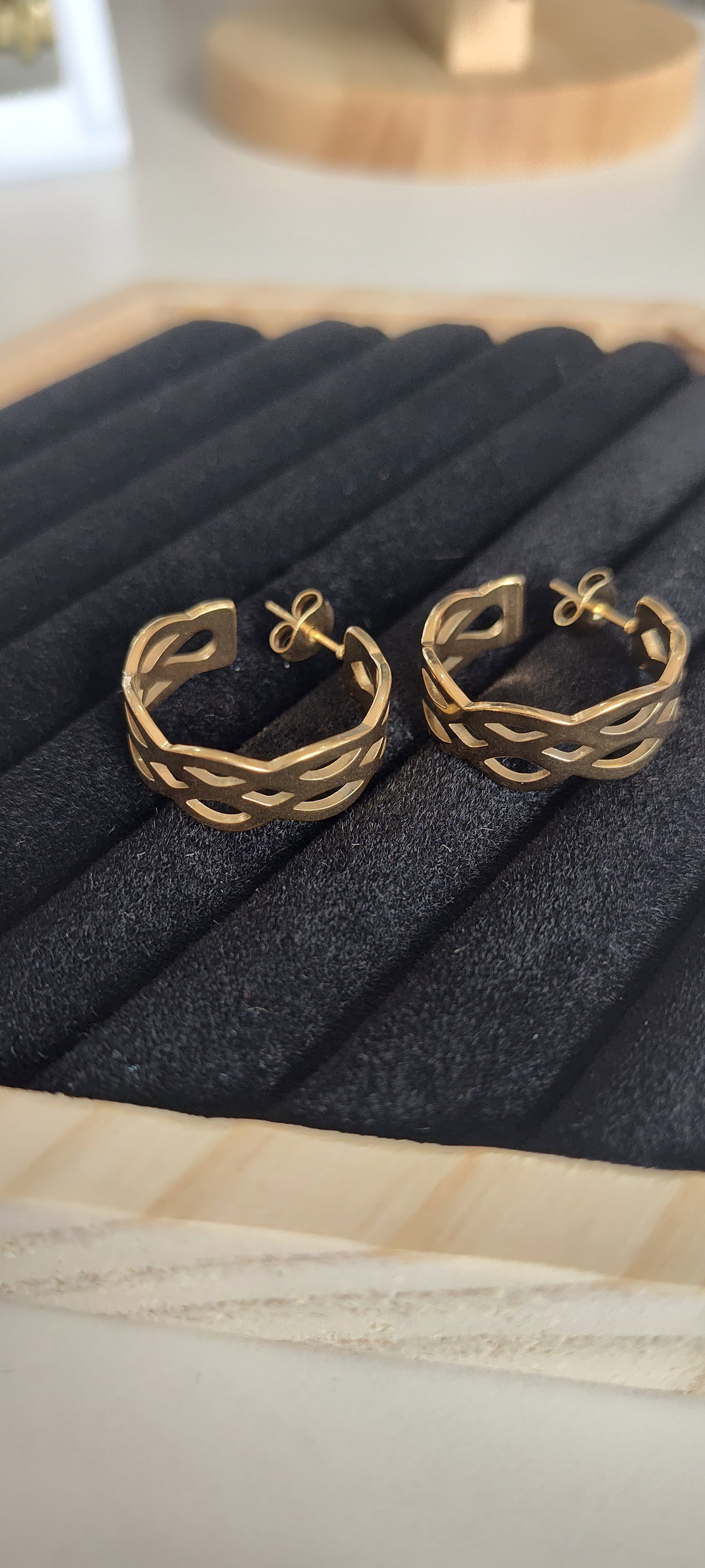 Con un diseño moderno y distintivo, estos aros anchos se destacan por su acabado calado con formas entrelazadas que generan un efecto visual llamativo y elegante.