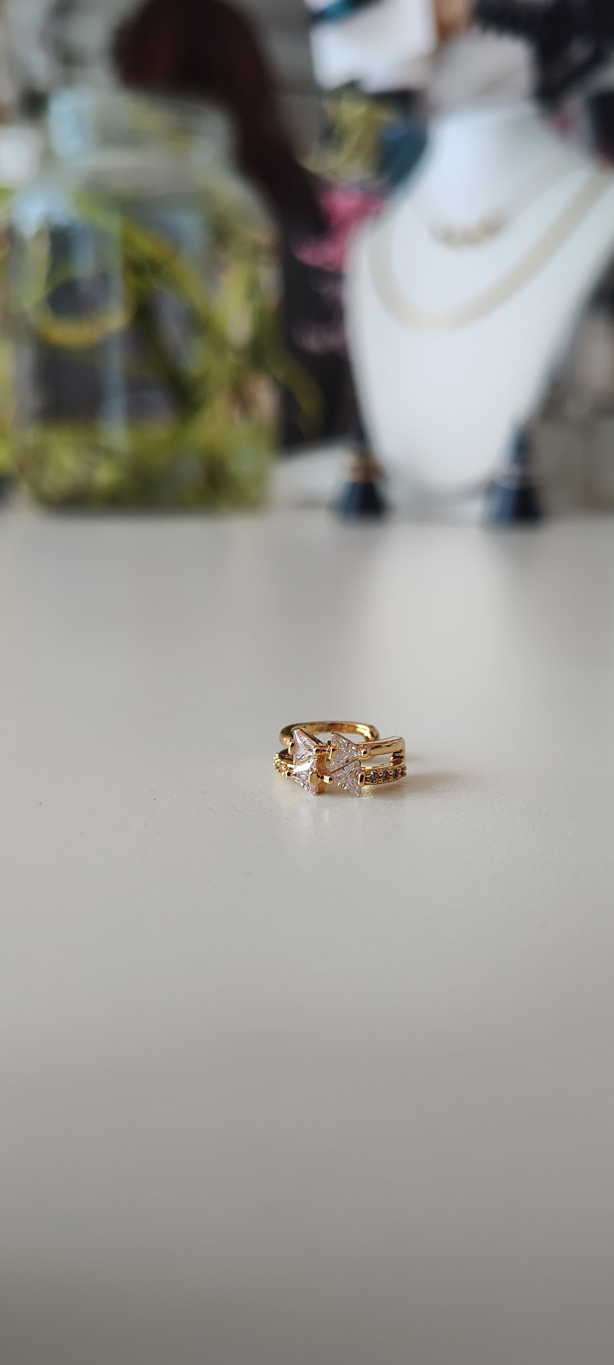 Cuff AD Cristalito es un diseño elegante y delicado que no requiere perforación adicional. Presenta una estructura dorada con doble aro, decorada con pequeños strass incrustados que aportan brillo sutil.