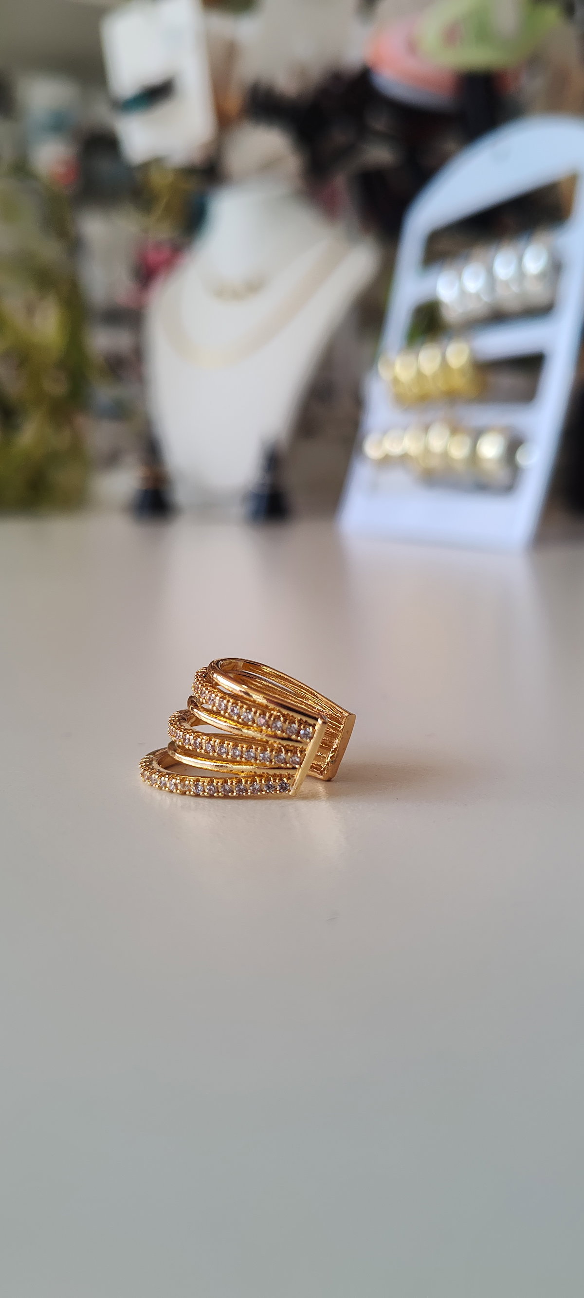 Cuff AD Líneas Strass se destaca por su diseño moderno y llamativo, formado por varias líneas paralelas doradas que rodean la oreja con elegancia. Cada línea está cuidadosamente decorada con pequeños strass que aportan brillo y sofisticación, logrando un efecto de lujo y estilo único.