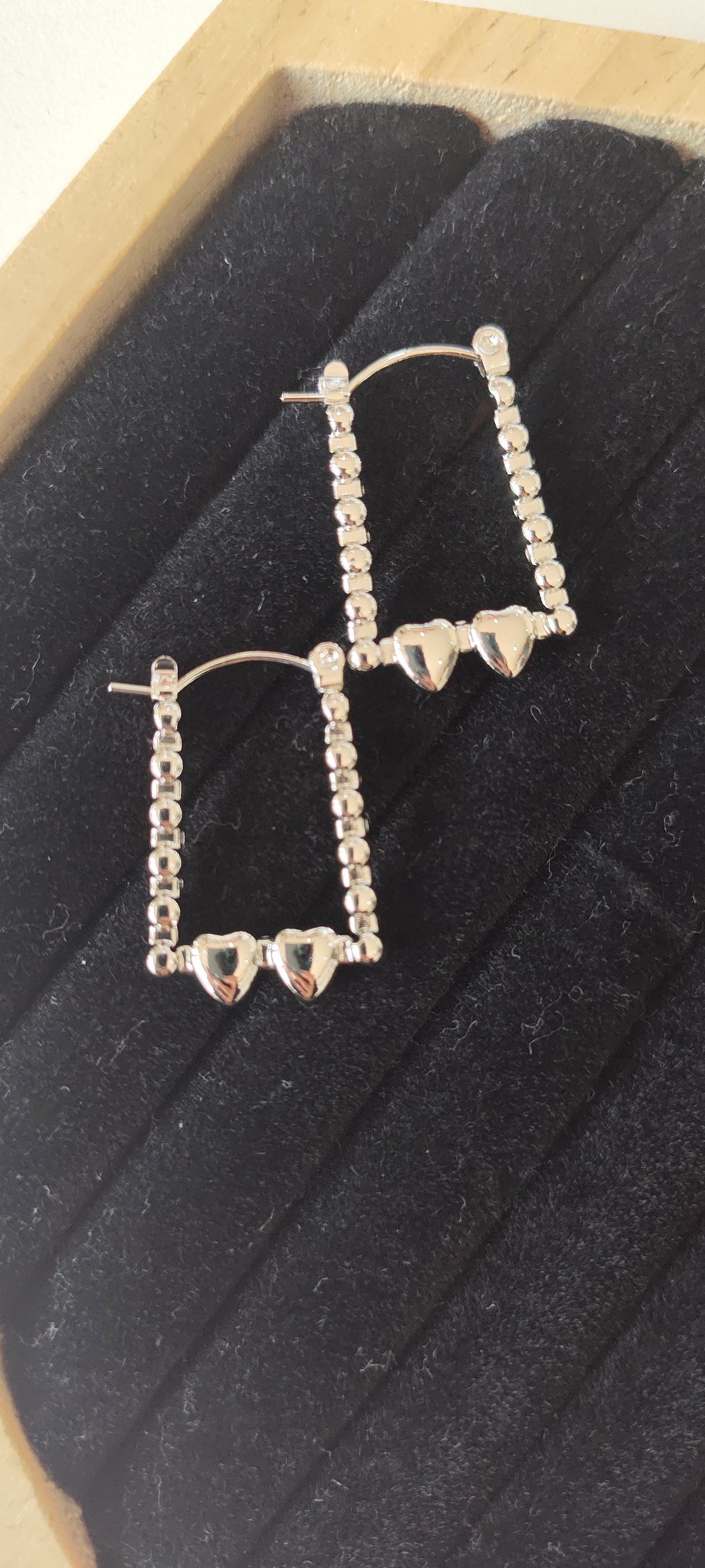 Un modelo diferente que rompe con la forma circular clásica: argollas cuadradas formadas por pequeñas esferas, con dos corazones en el centro que aportan un toque romántico y juvenil. Son modernas y divertidas, ideales para regalar o usar en un look fresco y casual.