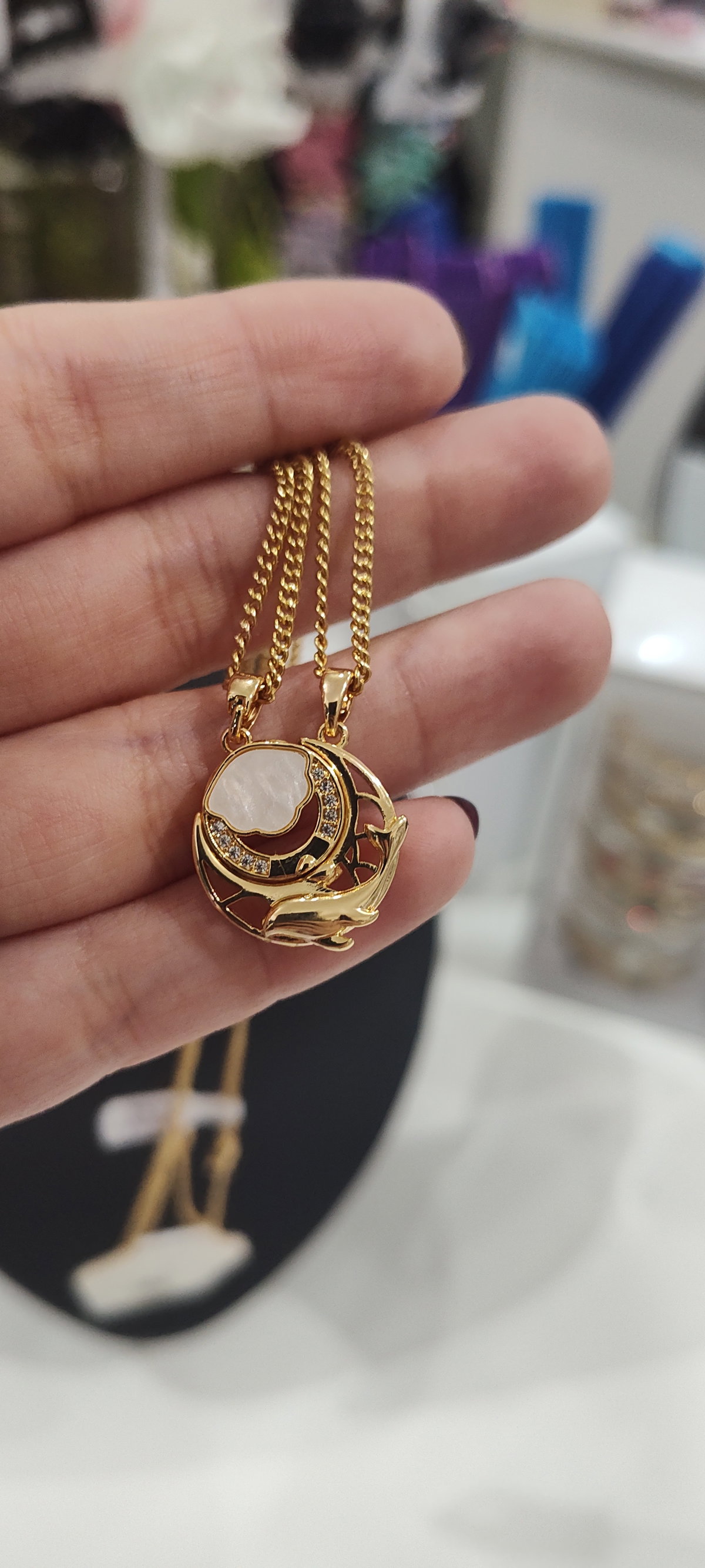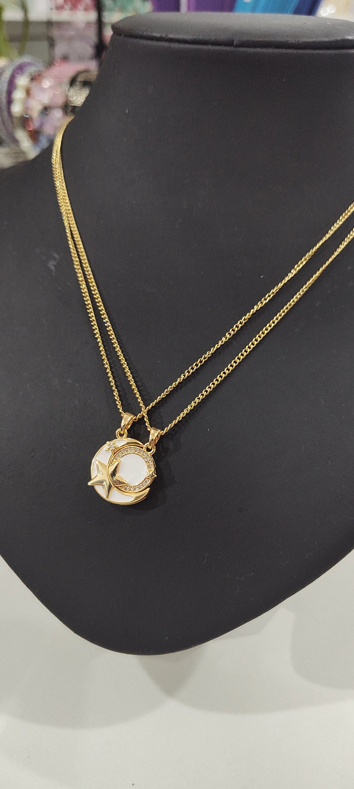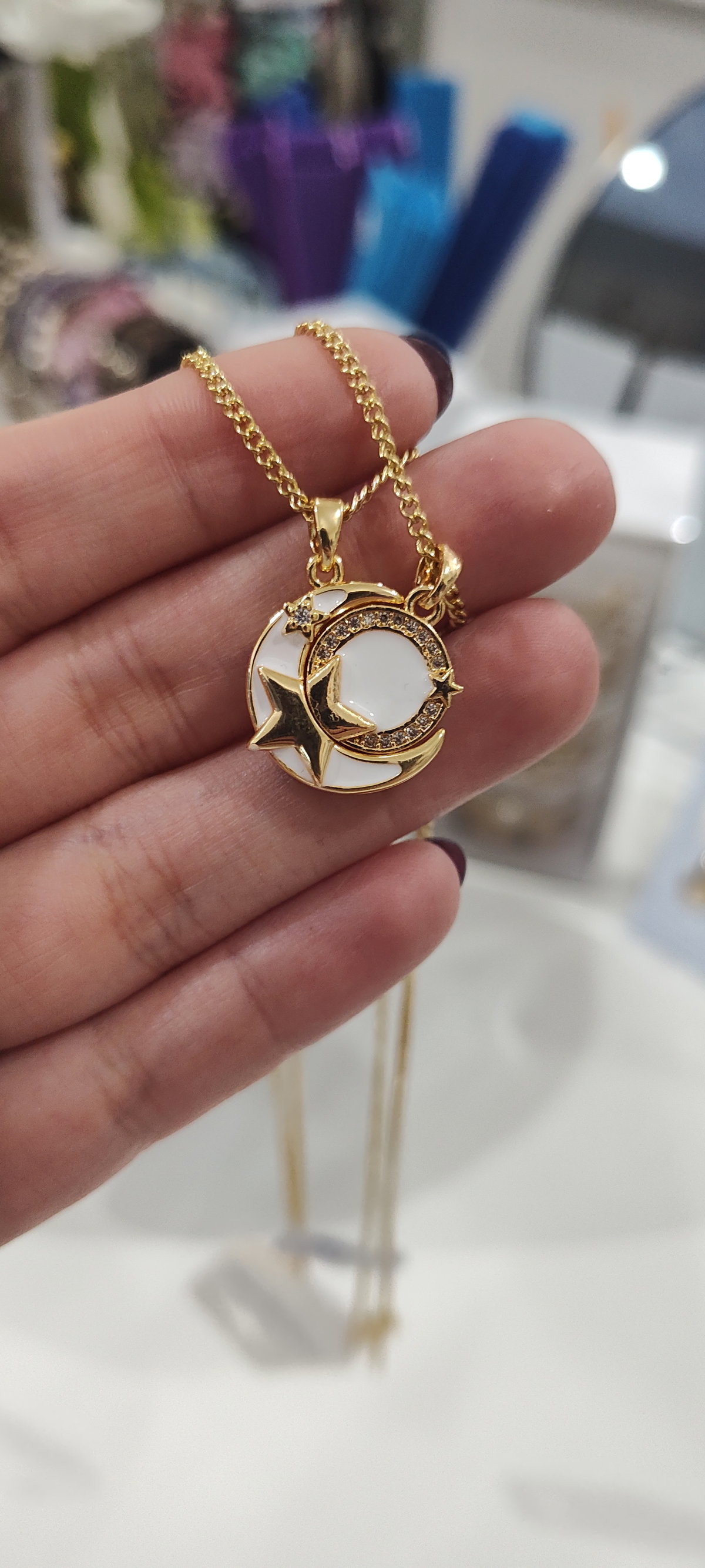 Estos collares para compartir en dorado, traen dijes de luna creciente y estrella que simboliza la belleza y la magia del cielo nocturno. La luna creciente puede representar nuevos comienzos, crecimiento y cambio, mientras que las estrellas simbolizan esperanza, guía e inspiración. También es un símbolo reconocido asociado con el Islam.