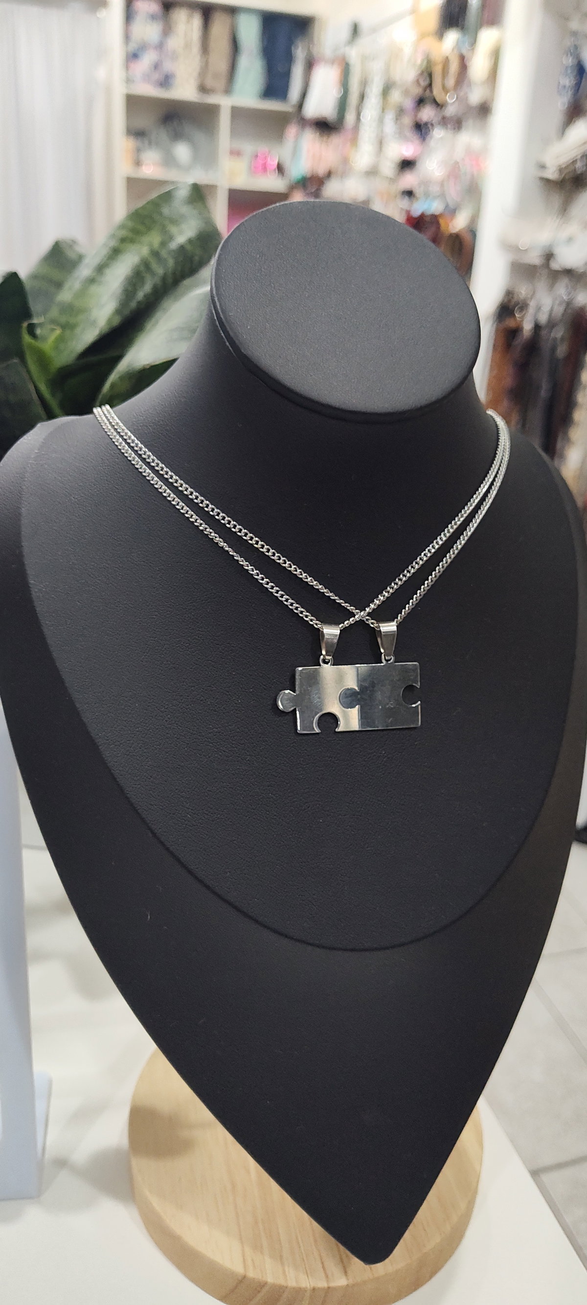 Collar plateado con diseño moderno y minimalista, ideal para simbolizar conexiones únicas. Incluye dos cadenas con un dije en forma de rompecabezas partido, perfecto para compartir entre dos personas que se complementan. Representa ese lazo especial que encaja a la perfección: amistad, pareja o familia. Un detalle simple pero lleno de significado.