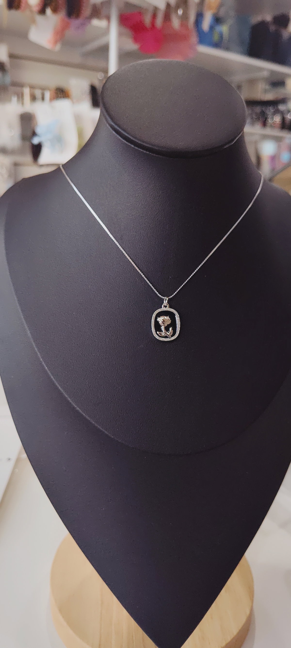 Un diseño delicado y atemporal. Esta cadena AQ presenta un dije rectangular con un fondo negro esmaltado que realza la figura de una flor en relieve. Su terminación plateada y detalles texturados en el borde aportan un estilo clásico y sofisticado, ideal para complementar cualquier look. Perfecta para quienes buscan un accesorio sutil, femenino y con personalidad.