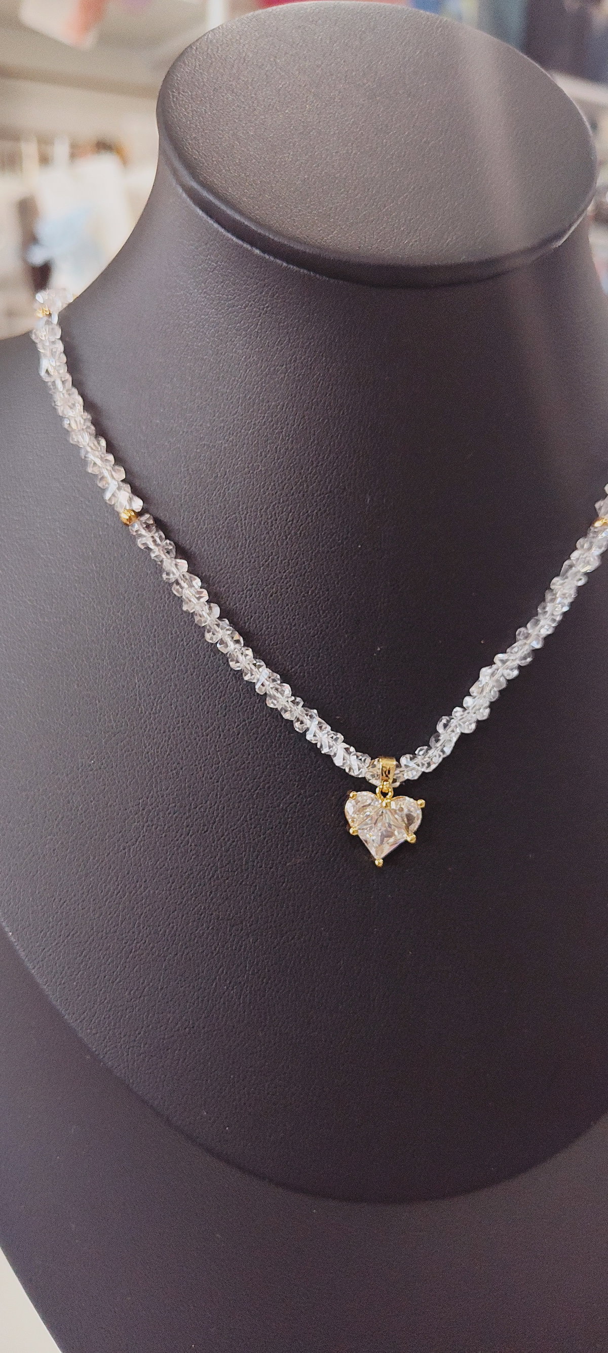 Este encantador collar es el accesorio perfecto para añadir un toque de elegancia y romanticismo a tu estilo. Combina la delicadeza de una cadena de cuentas brillantes con un clásico colgante en forma de corazón dorado, creando una pieza versátil que se adapta tanto a looks casuales como a ocasiones especiales.