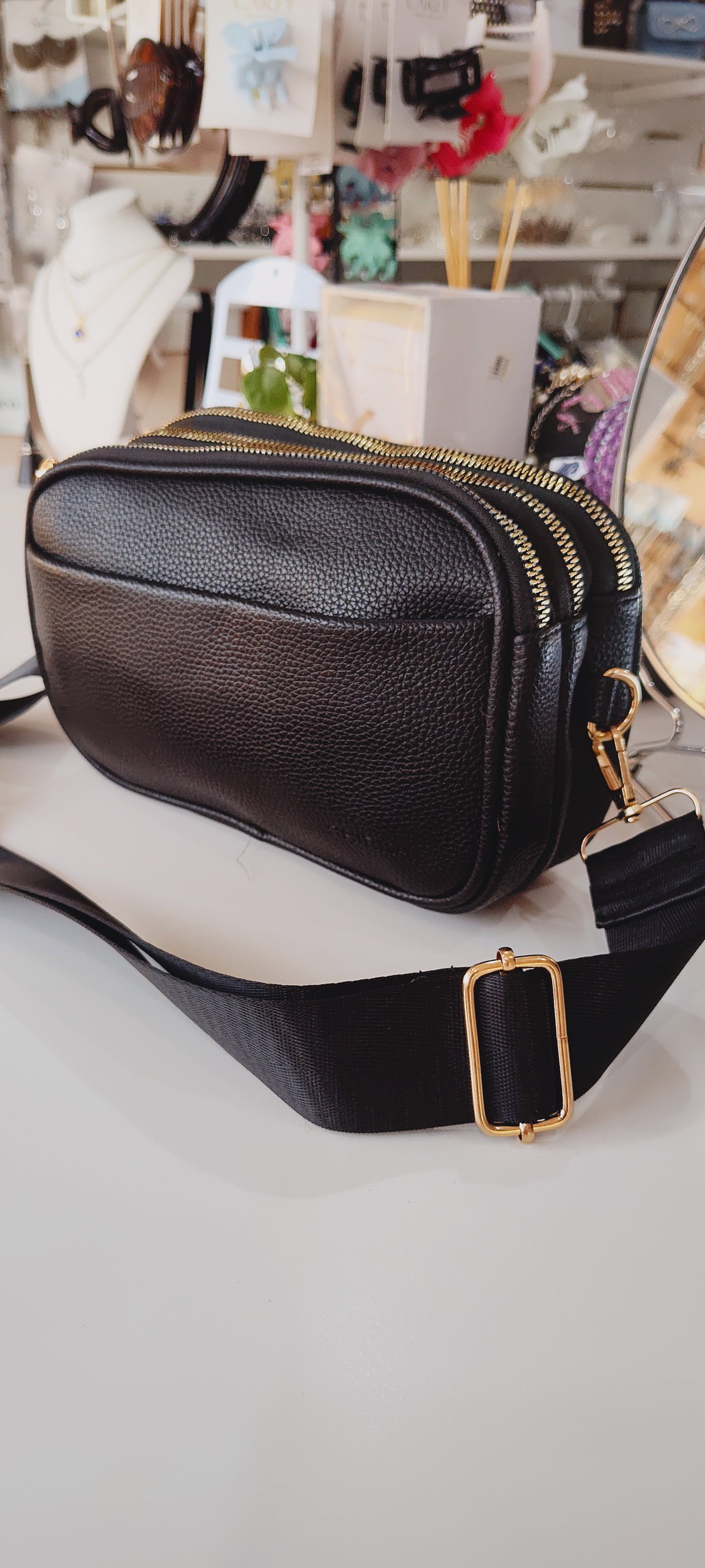 bandolera elegante y funcional, ideal para el uso diario. Está fabricado en material sintético de textura granulada y cuenta con dos compartimentos principales con cremalleras. Su característica distintiva es la correa de tela ancha y ajustable, que ofrece gran comodidad y un toque moderno.