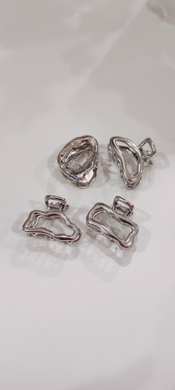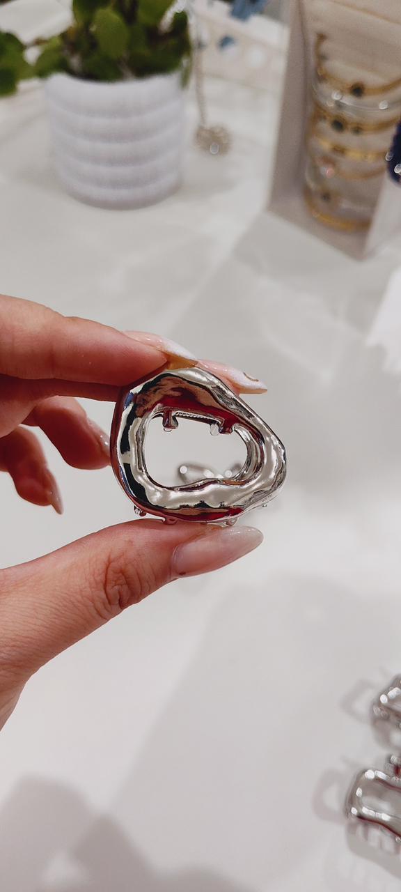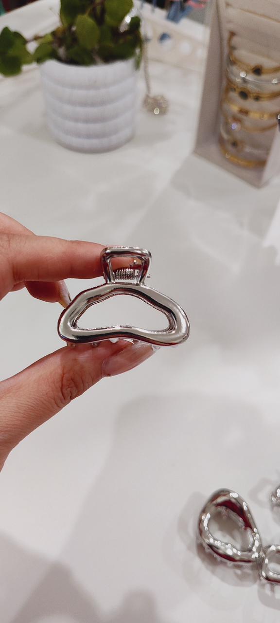 Clip plateado con diseño abierto de forma orgánica, similar a una gota irregular. Su estructura ondulada y pulida aporta un estilo moderno y artístico. Ideal para sumar un toque distintivo a cualquier peinado.