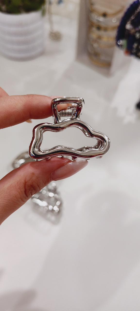 Clip plateado con forma ondulada que recuerda a una nube estilizada. Posee un diseño orgánico y dinámico que aporta personalidad y movimiento. Perfecto para uso diario.