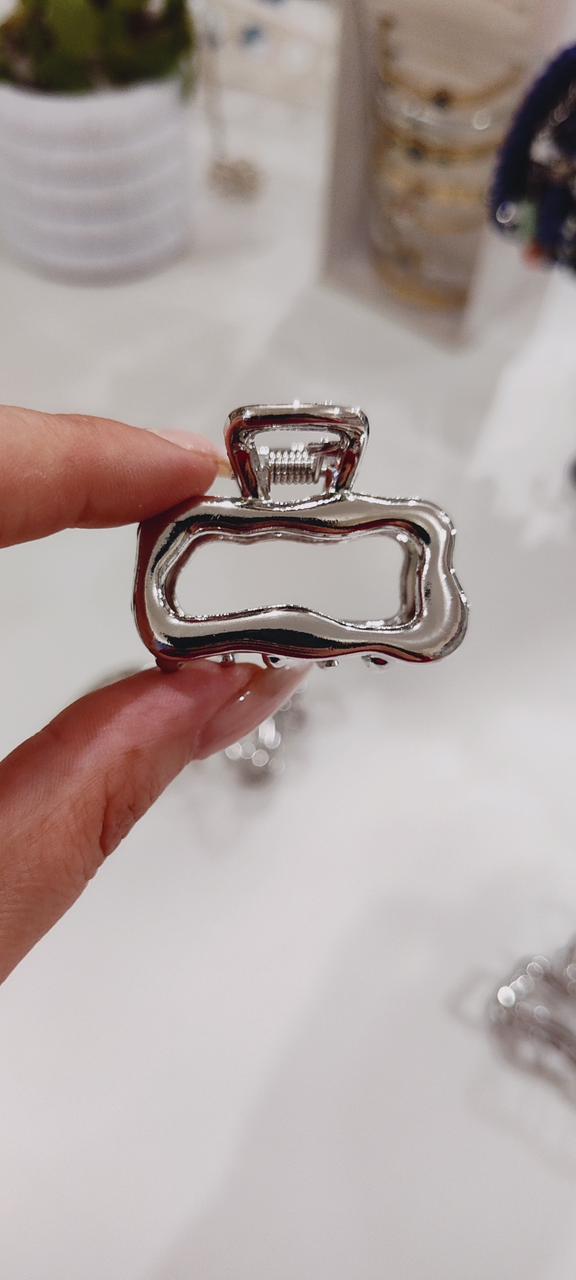 Clip plateado con contorno rectangular suavizado y bordes ondulados. Combina simplicidad con un toque artístico, ideal para looks minimalistas con un detalle moderno.