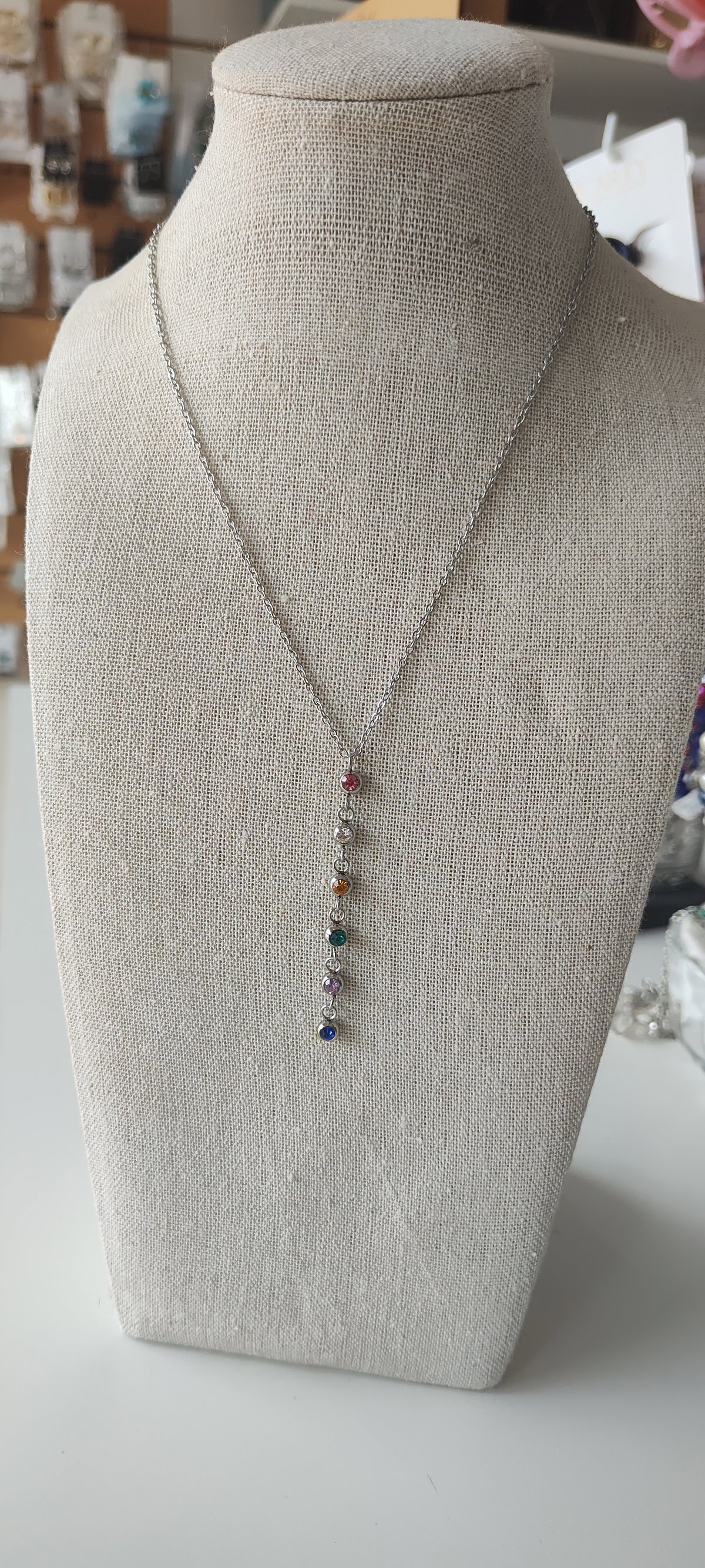 Tiene un diseño tipo Y o corbatero, con una cadena delgada que desciende hasta un dije alargado con múltiples piedras de colores.