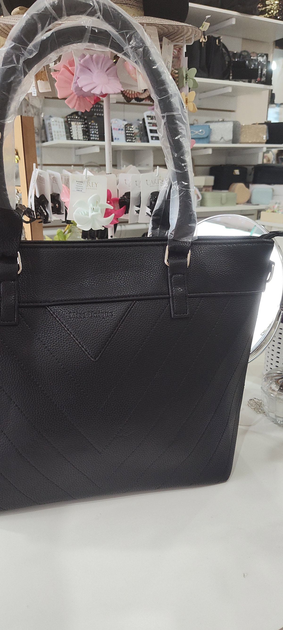 Cartera de color negro con un patrón de chevron y un detalle en forma de V en la parte frontal. Bolso de mano de gran tamaño, ideal para uso diario u oficina.