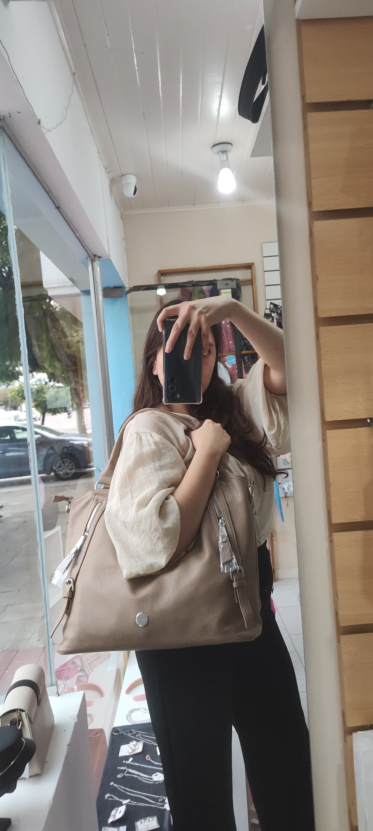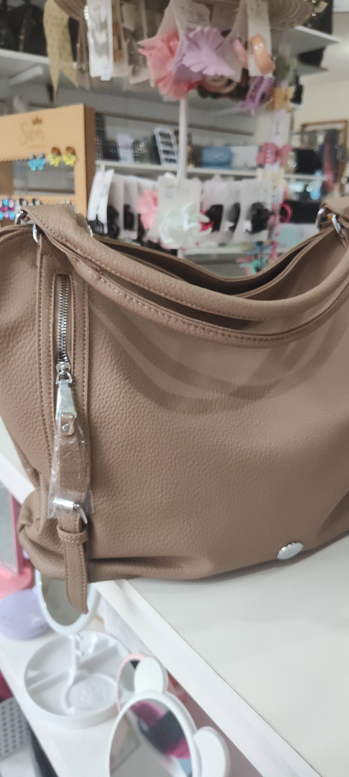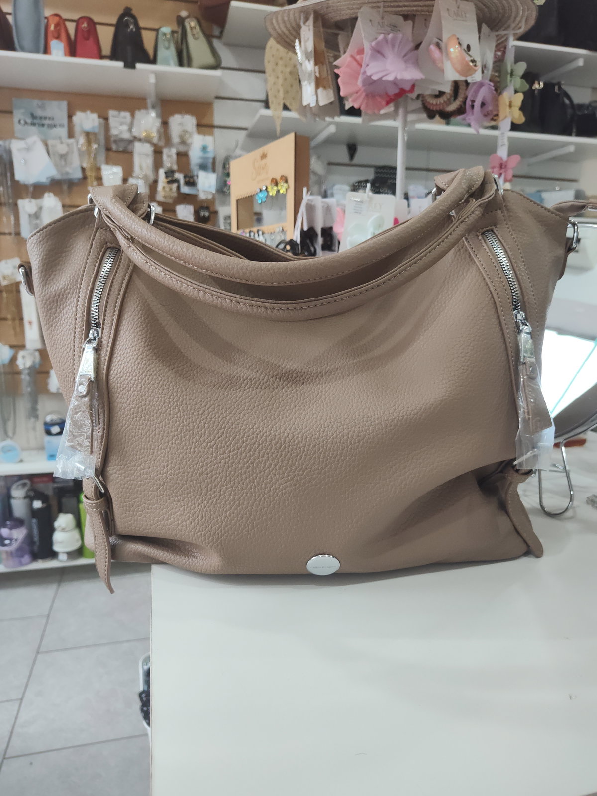 Este bolso es de color topo o beige, con cierres de cremallera en la parte superior y en los laterales. Las asas son cortas, de mano, y tiene un diseño de estilo flexible o "hobo".