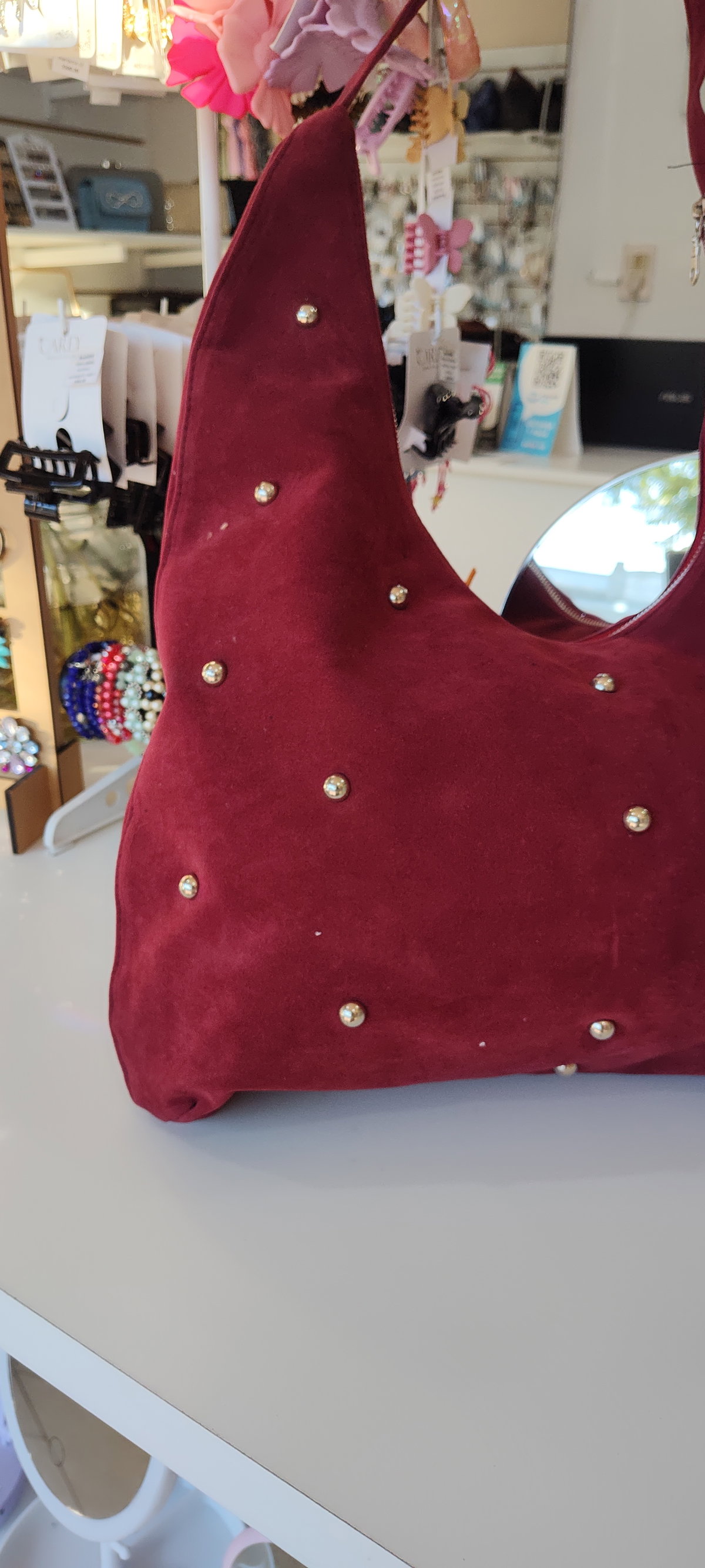 Esta cartera es un tipo debolso de gamuza con tachuelas de estilo boho o casual. El bolso parece tener un diseño moderno y es espacioso, con detalles de tachas metálicas.