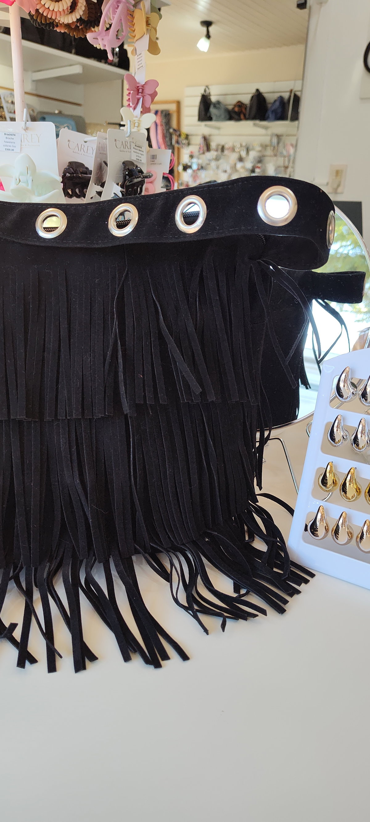 Este es un bolso de hombro Texano que fusiona elegancia con un espíritu libre. Confeccionado en un suave material, gamuza, su diseño está definido por una exuberante cascada de flecos que se mueven con cada paso.