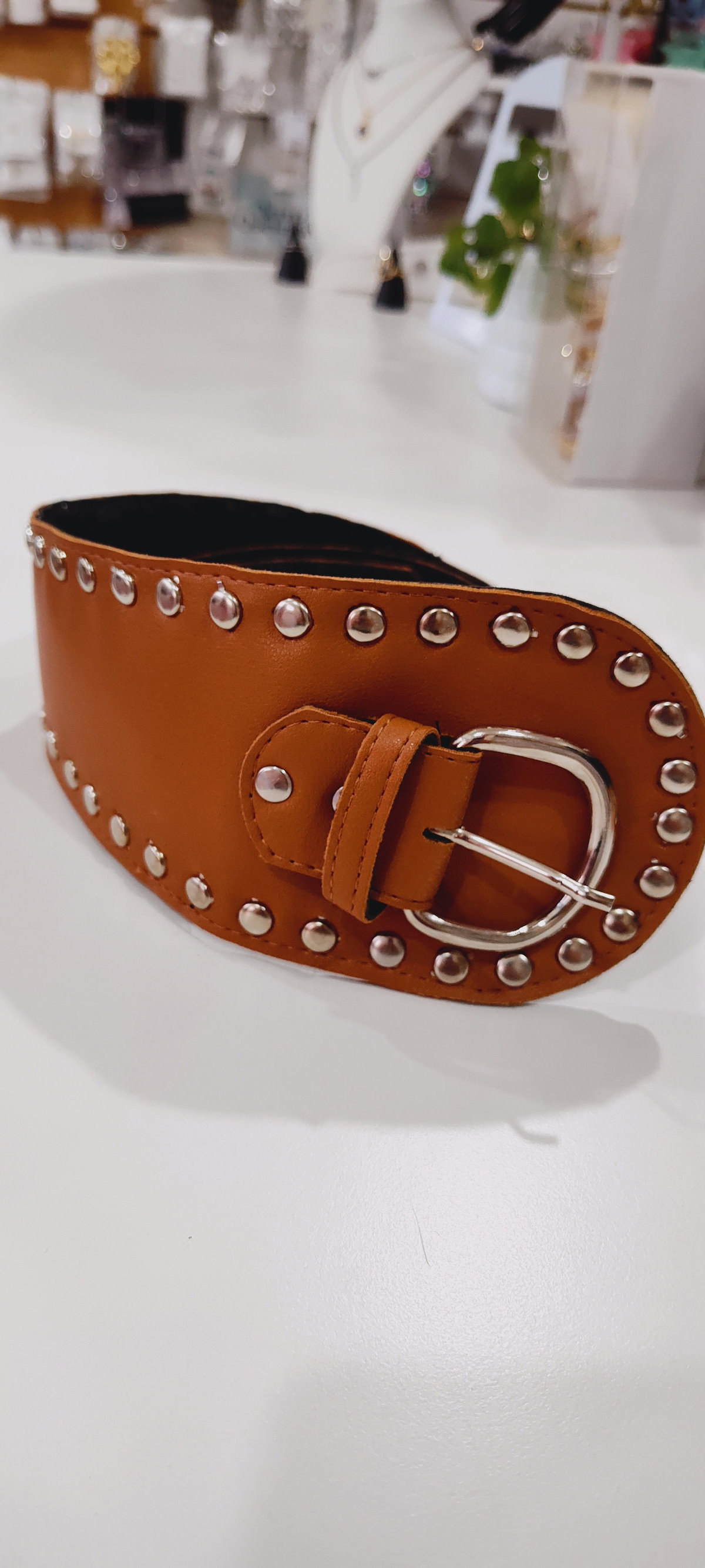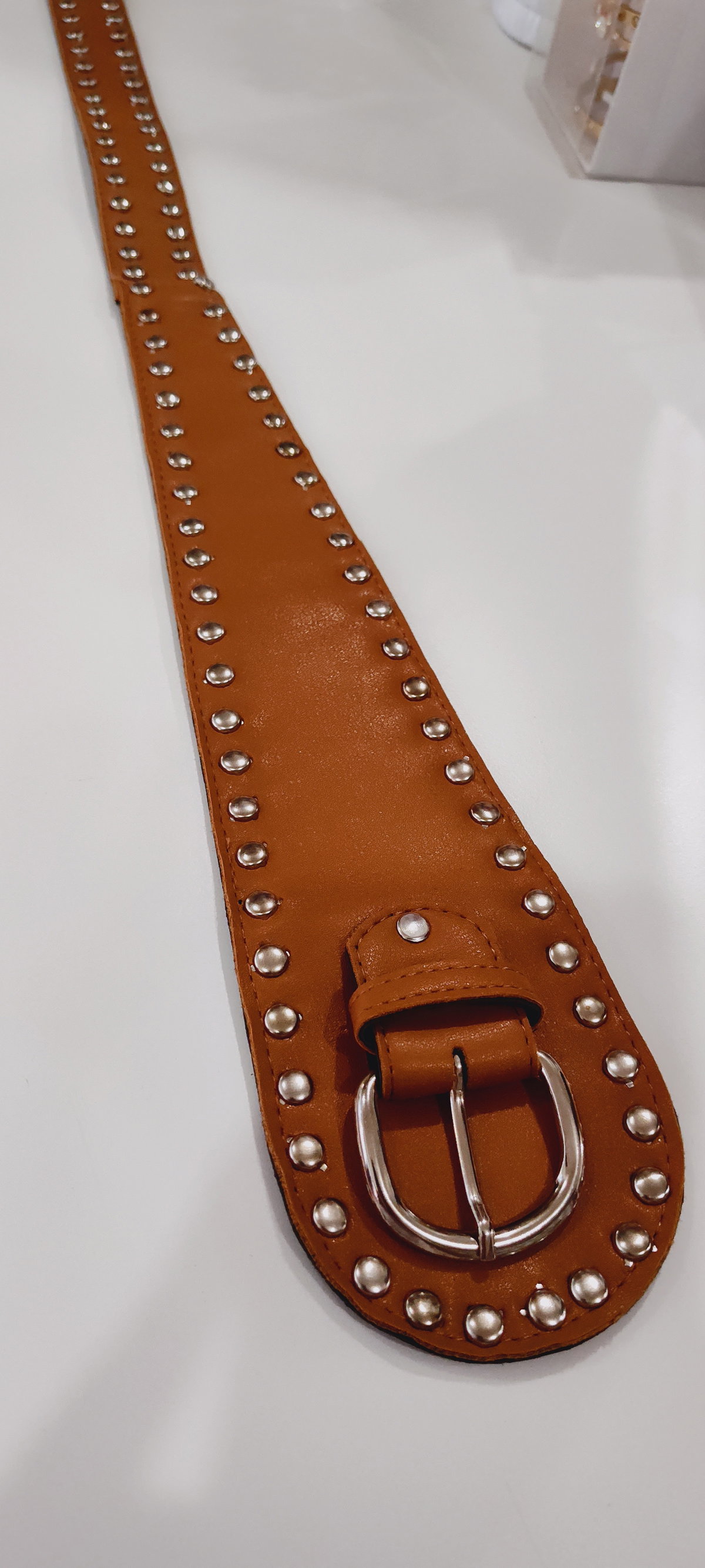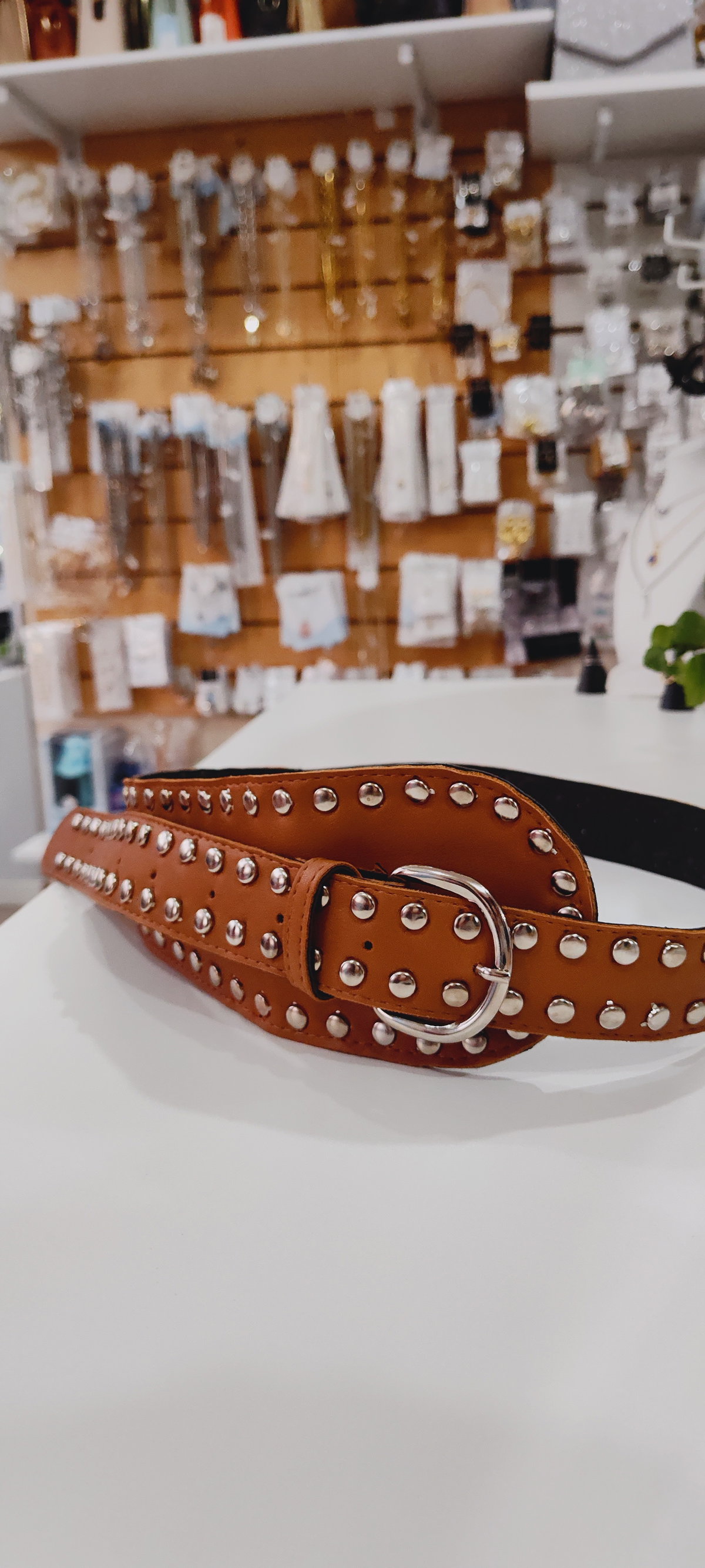 Cinturón de ecocuero color suela con tachas plateadas y hebilla metálica. De estilo moderno y canchero, perfecto para complementar jeans, shorts o vestidos. Ideal para sumar un toque de brillo y personalidad a tus outfits diarios.