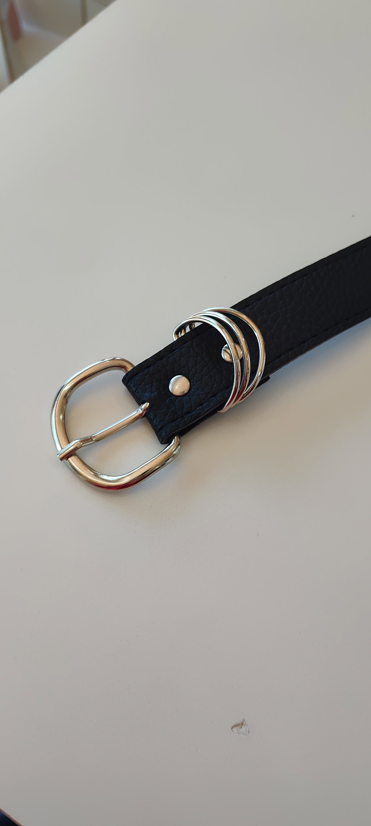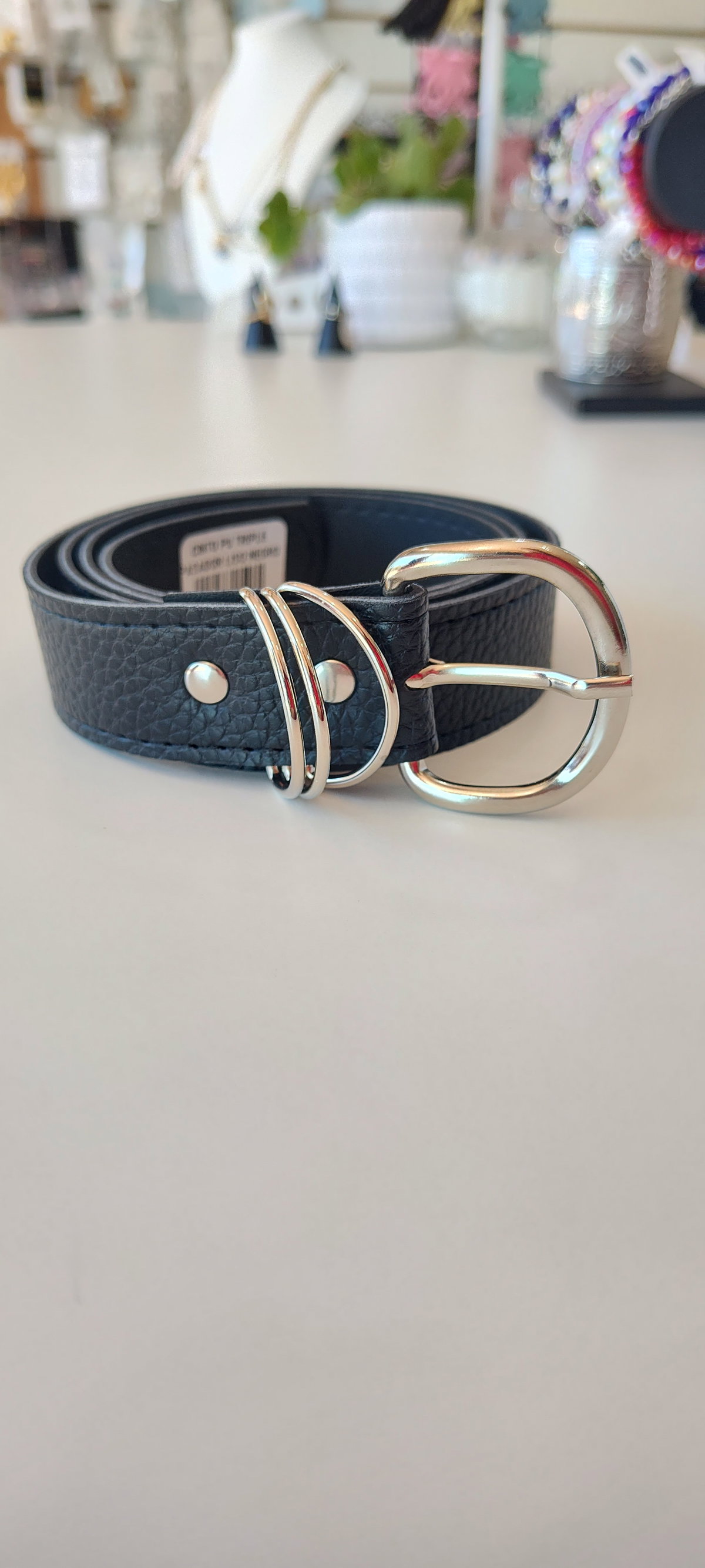 Cinturón de ecocuero negro con textura tipo graneada y hebilla metálica doble aro.