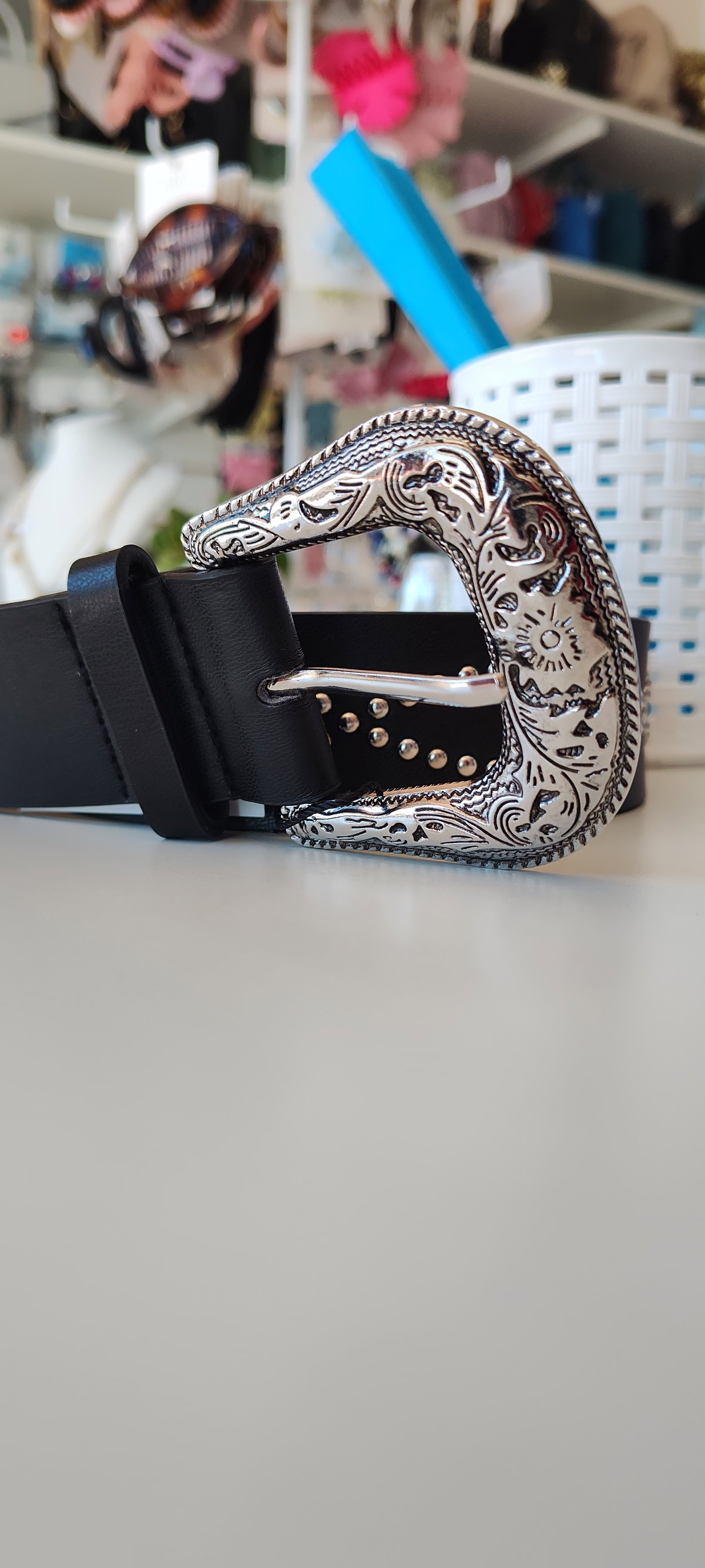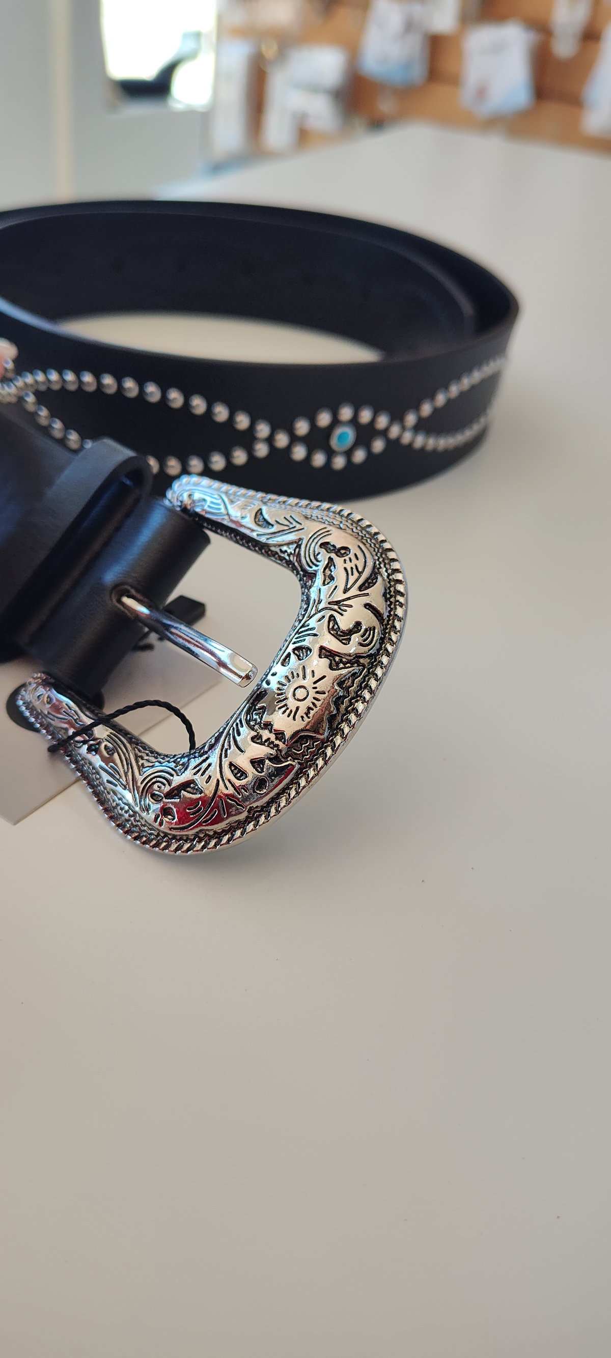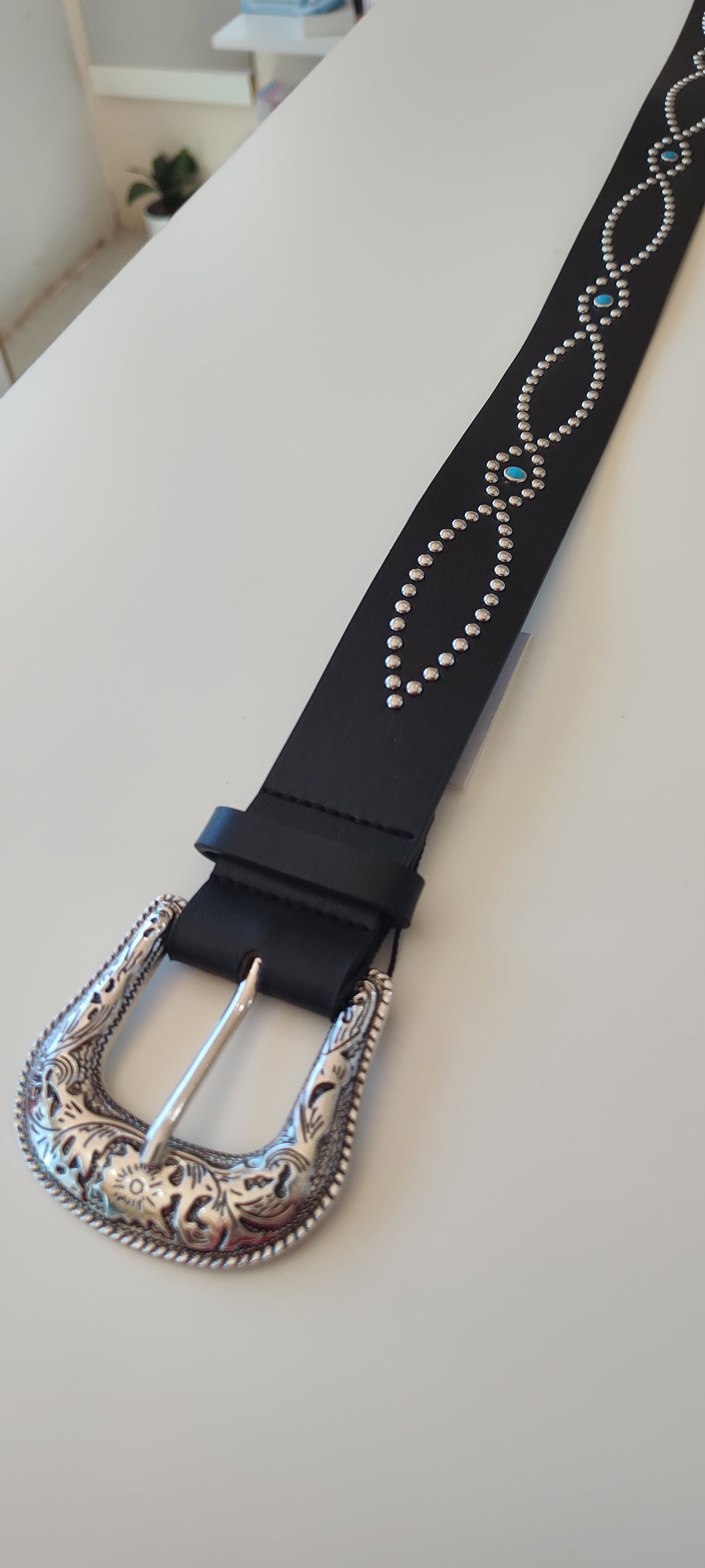 Cinturón de ecocuero negro con diseño de tachas plateadas y detalles turquesa.