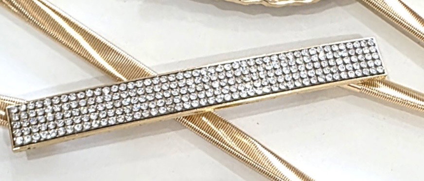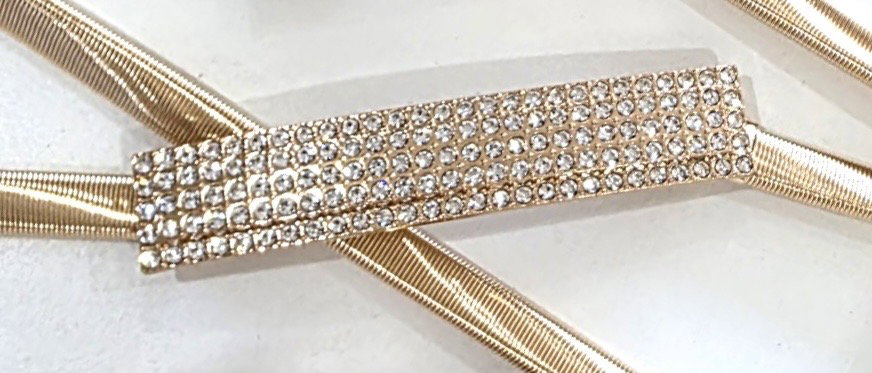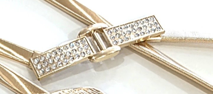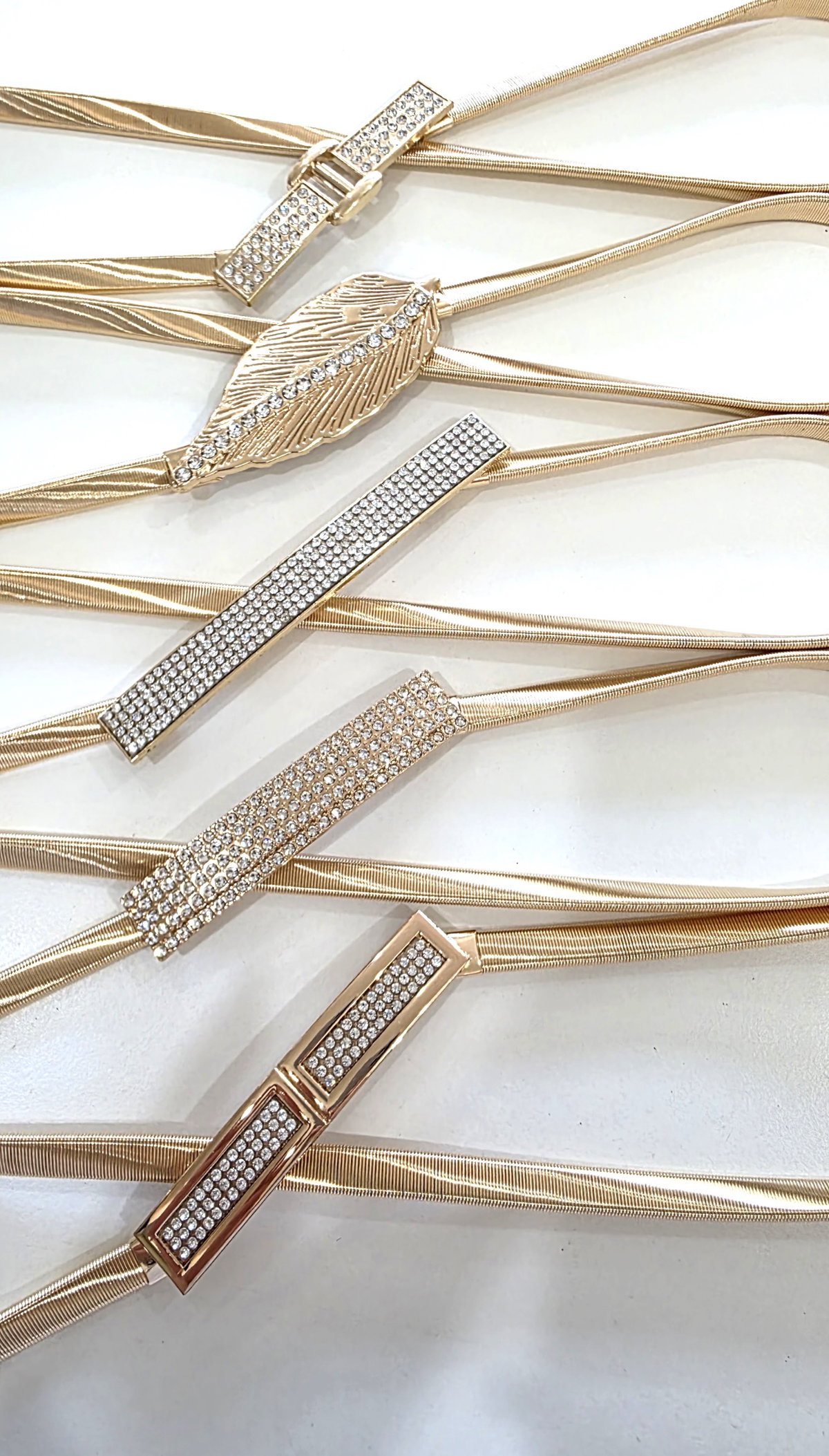 Cintos elásticos de diseño elegante, confeccionados en tono dorado y con apliques centrales de strass que aportan brillo y sofisticación. Ideales para realzar la cintura y complementar vestidos, blazers o conjuntos tanto de día como de noche.