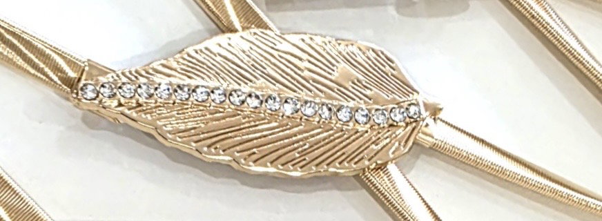 Cinto dorado con aplique central en forma de pluma texturada y detalle de strass en línea. Delicado y femenino, aporta un toque sofisticado y original.