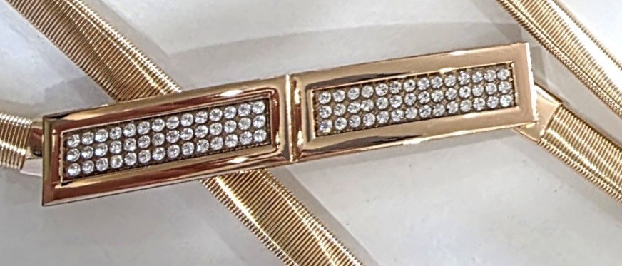 Cinto elástico dorado con placa rectangular en tono dorado, totalmente cubierta de strass. Clásico, luminoso y elegante.