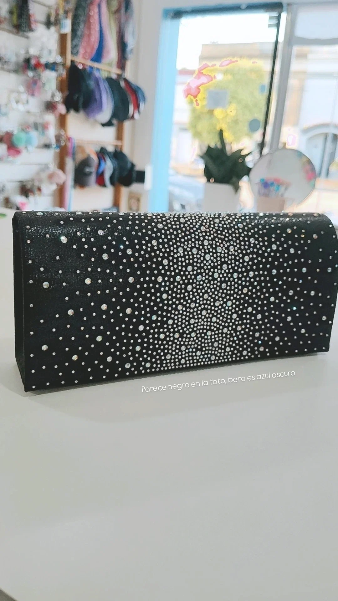 Clutch de fiesta azul oscuro, adornado con pedrería brillante que crea un patrón deslumbrante. Ideal para complementar con elegancia cualquier atuendo de noche, boda o evento especial. Su diseño compacto y sofisticado te hará brillar en cualquier ocasión.