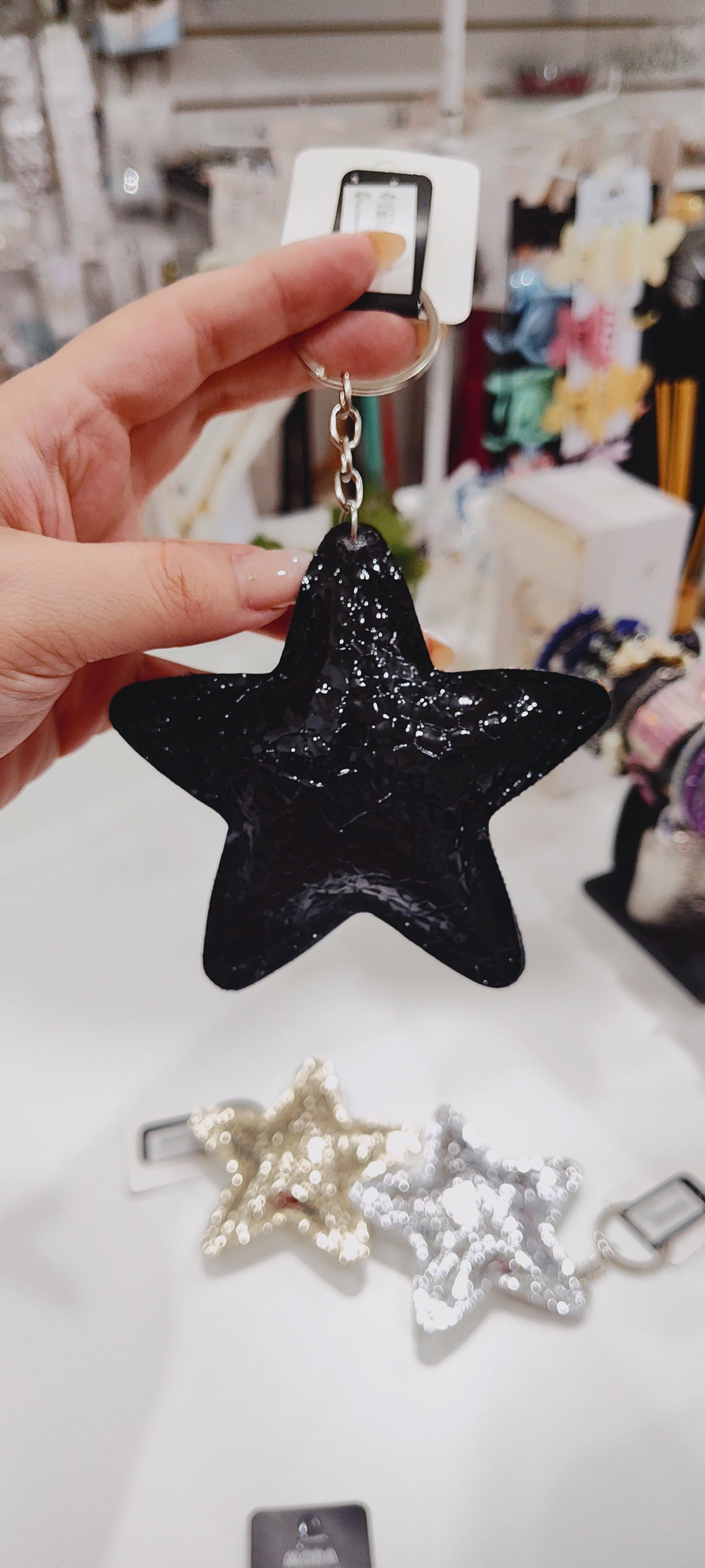 Llavero de estrella en eco cuero negro con textura reptil y leve brillo. Clásico y versátil, fácil de combinar y de uso diario.