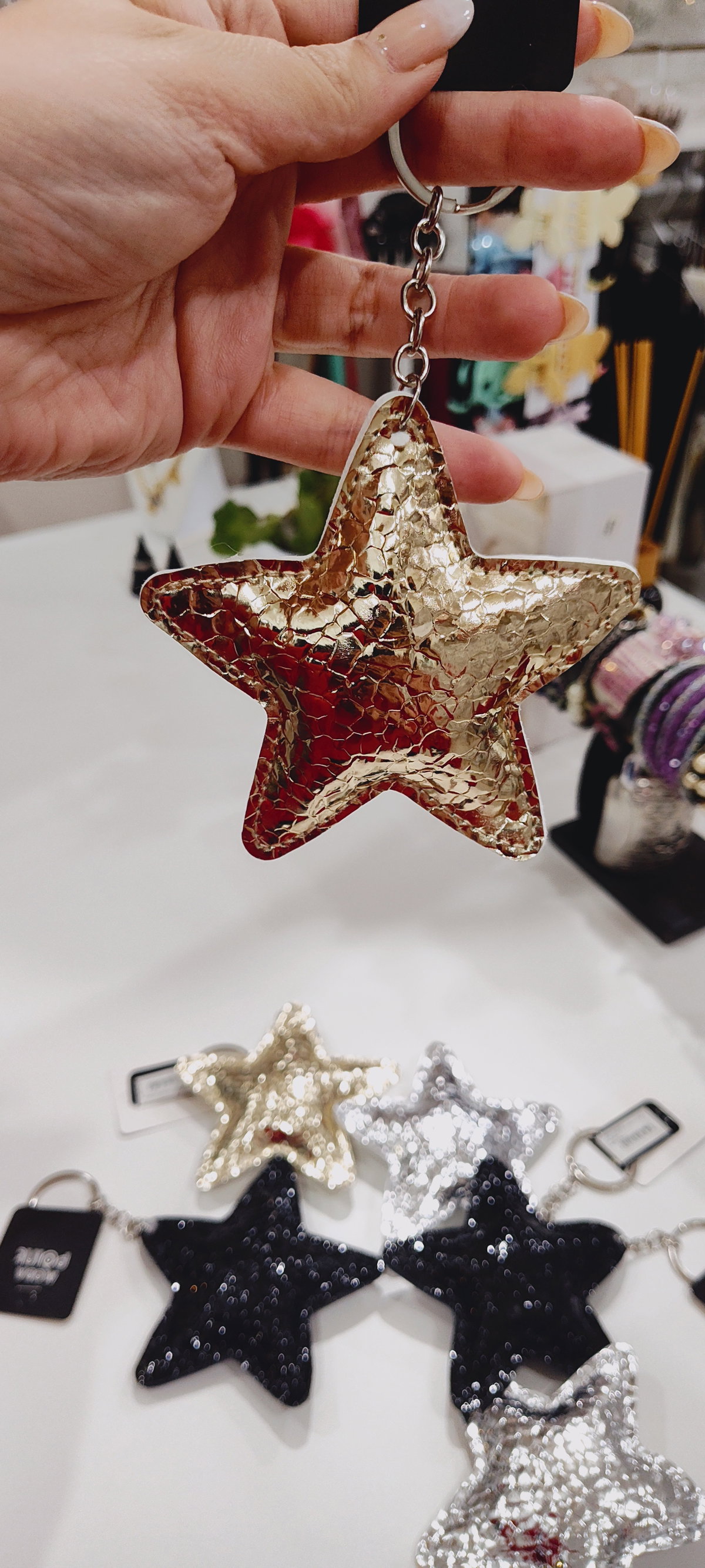 Llaveros con diseño de estrella en eco cuero de textura reptil y acabado brillante. Disponibles en dorado, plateado y negro. Modernos y llamativos, ideales para personalizar llaves, carteras o mochilas y sumar un detalle con estilo.