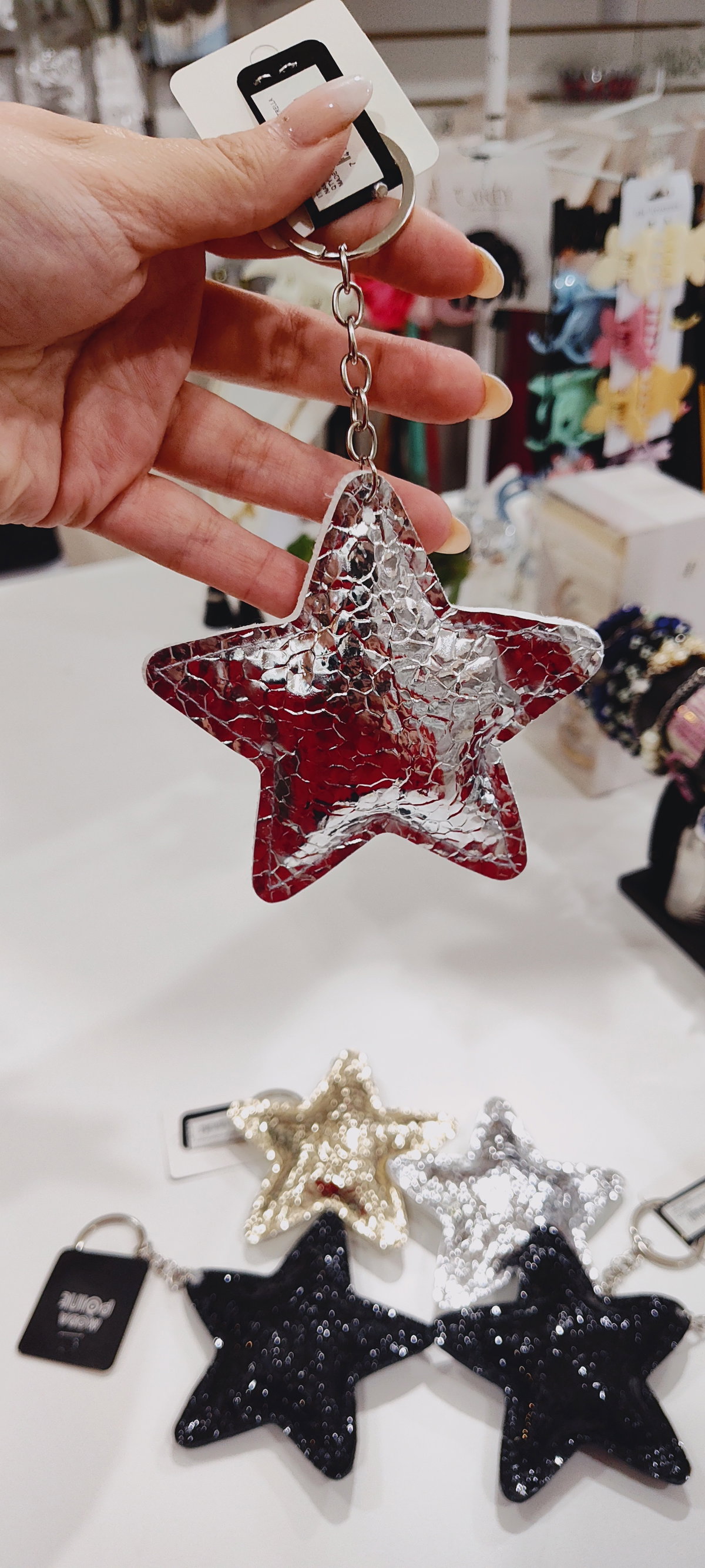 Llavero de estrella en eco cuero plateado con textura reptil. Moderno y luminoso, perfecto para destacar llaves o carteras.