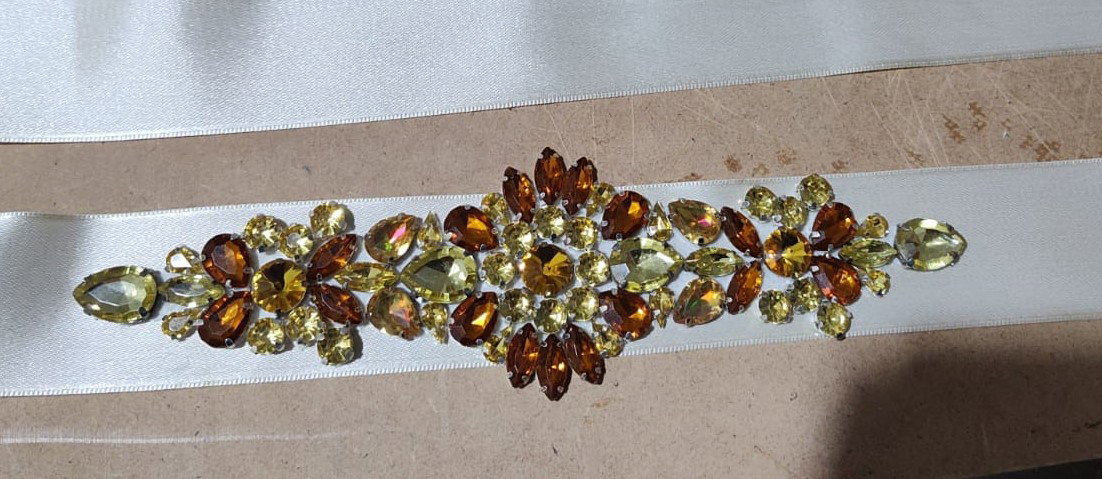 Cinto de gemas engarzadas sobre un lazo de raso color crema.