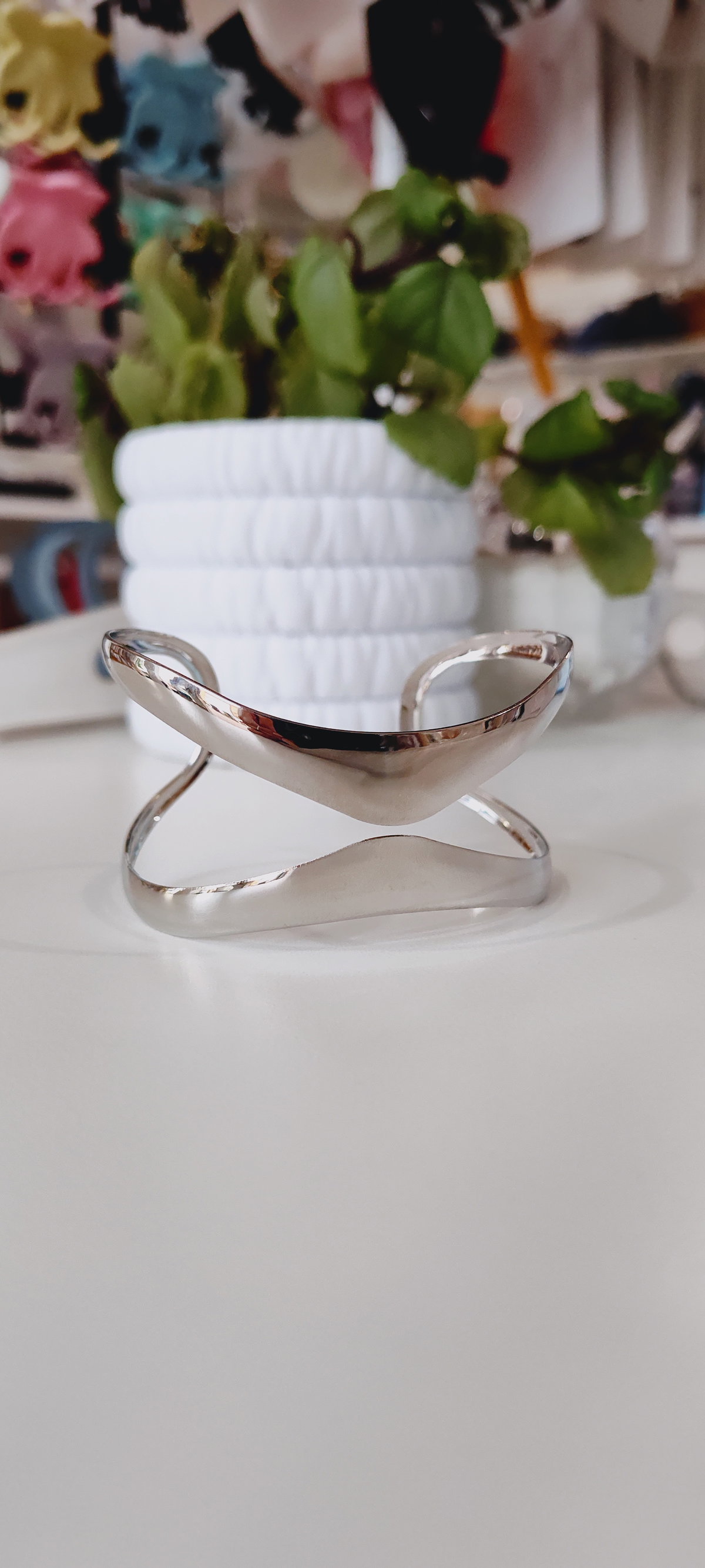 Descubre el encanto de la simplicidad moderna con este llamativo brazalete tipo esclava. Diseñado con líneas fluidas y orgánicas, este accesorio captura la esencia del movimiento, evocando la suavidad de las olas.