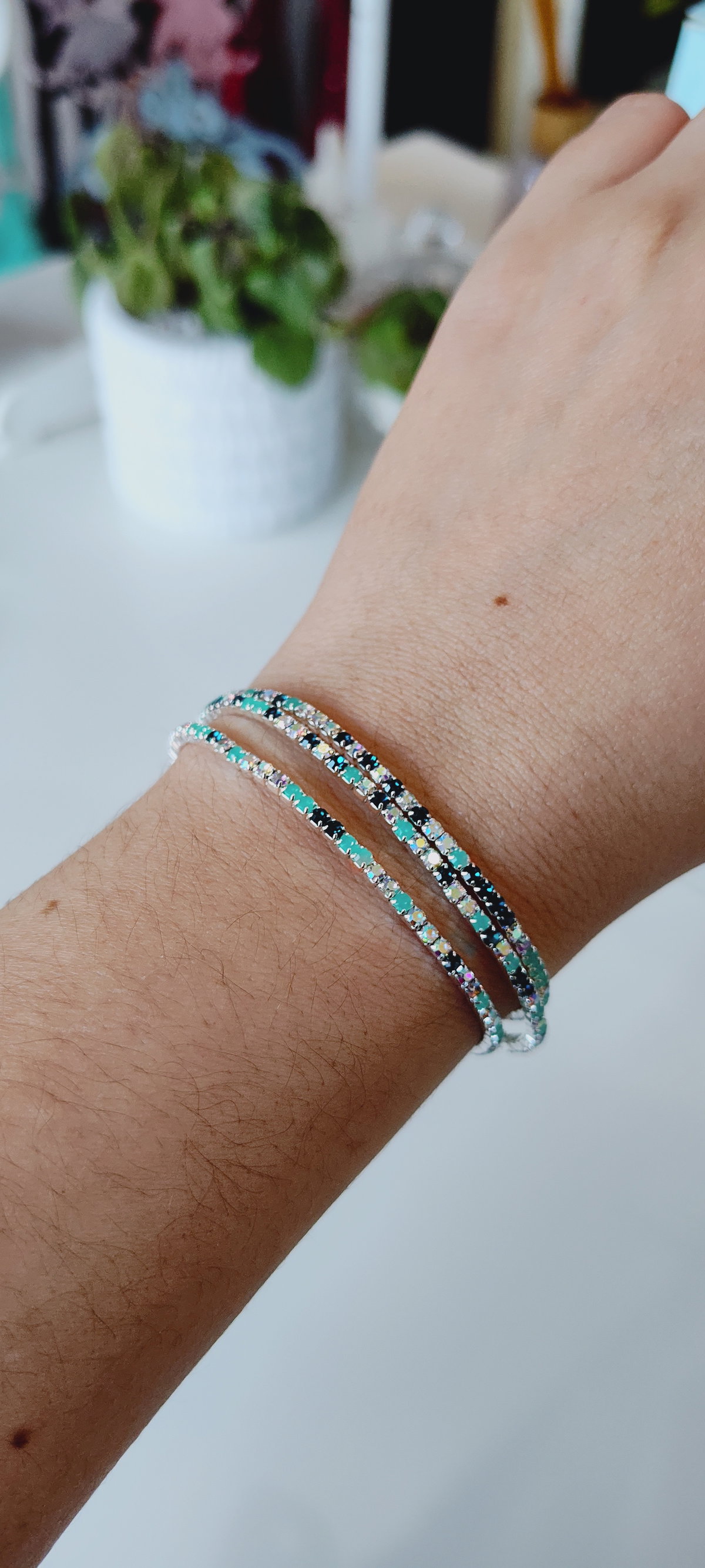 Descubre el Set de Pulseras acrilicas, una colección exclusiva de 10 pulseras elásticas diseñadas para apilarse y brillar. Este set imprescindible para el verano captura la luz con un acabado plateado de alto pulido y una deslumbrante variedad de cristales.