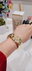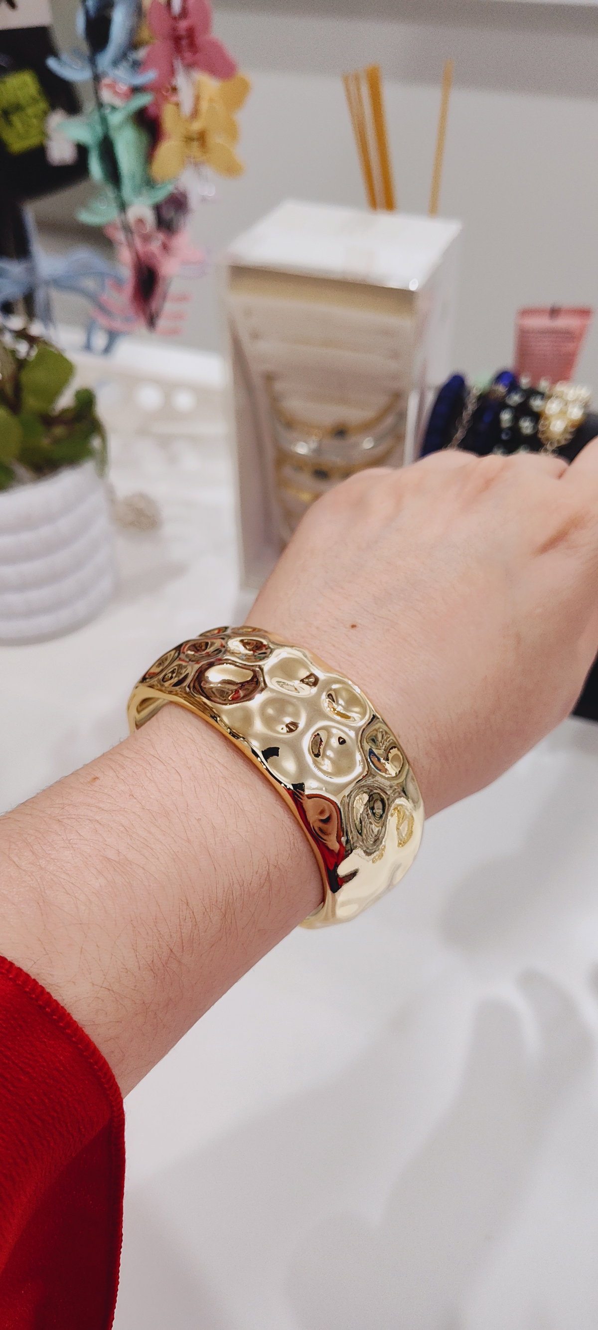 - Brazalete Martelé, brazalete rígido con textura martillada y acabado dorado brillante. Su superficie irregular genera reflejos únicos, aportando fuerza y personalidad al look.