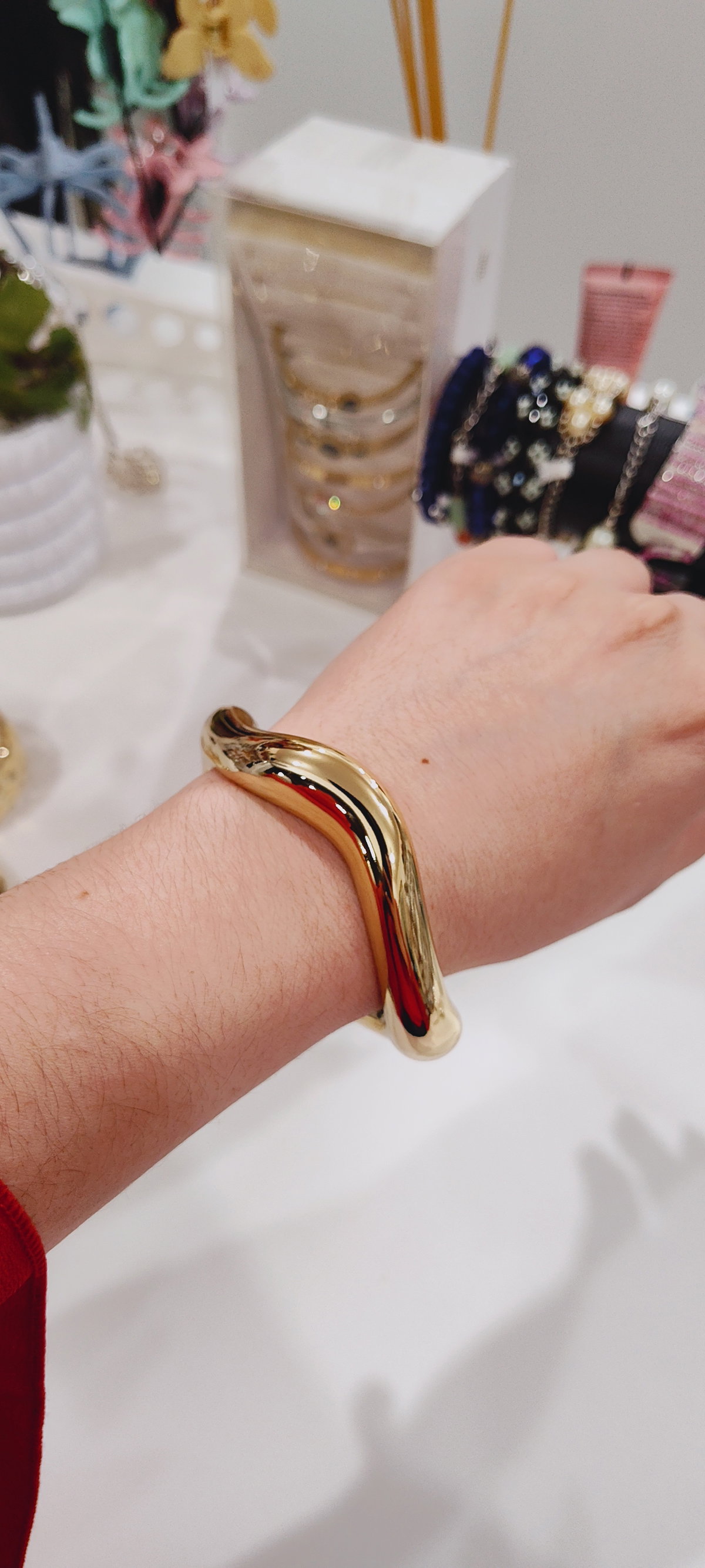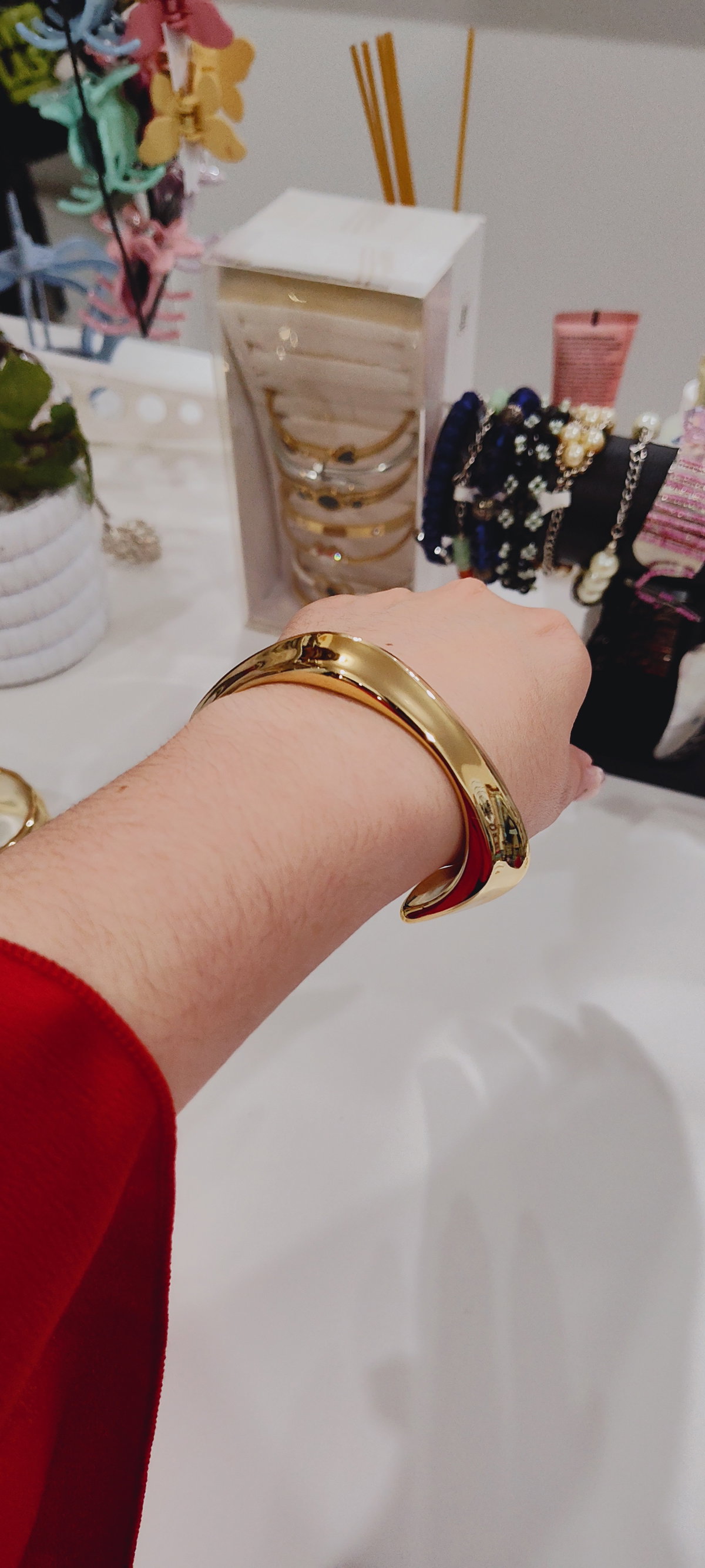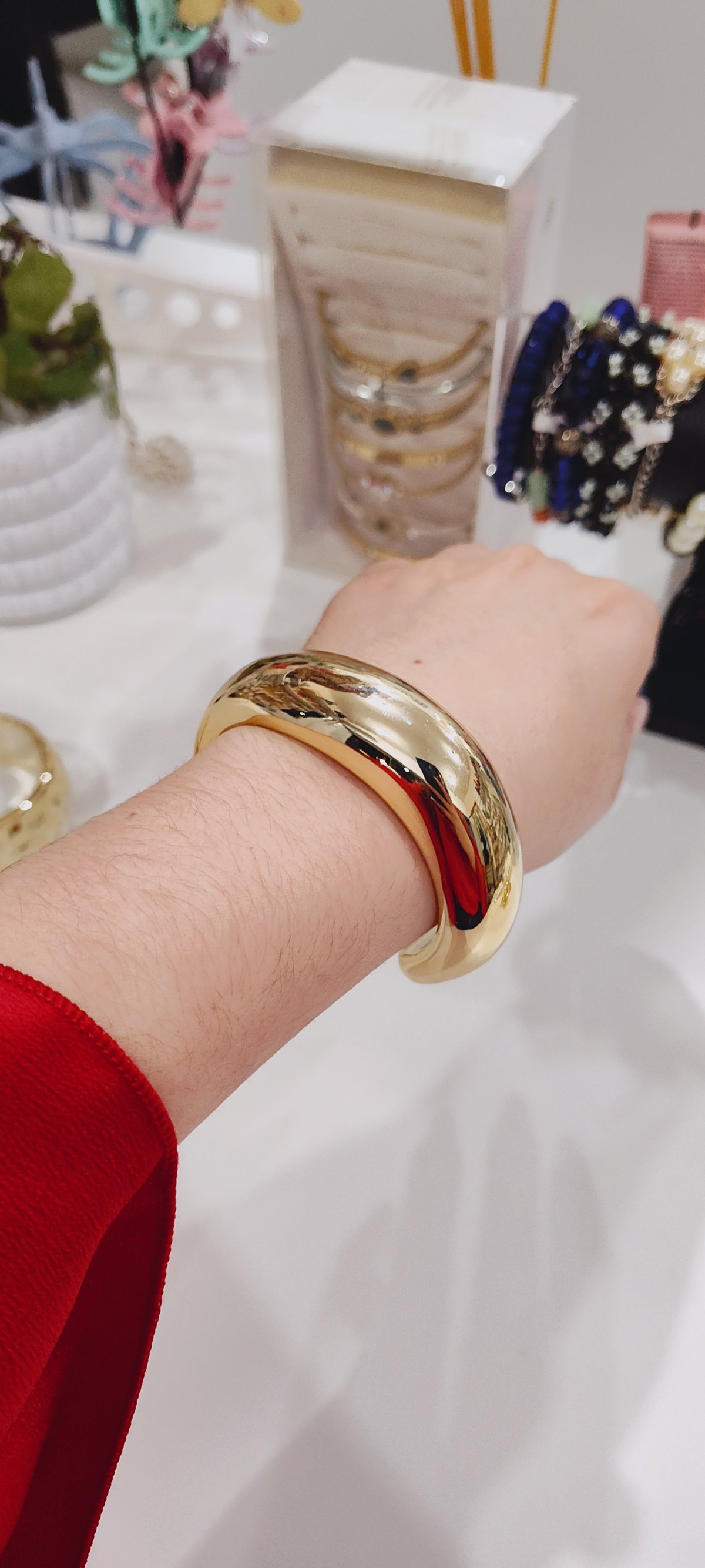 - Brazalete Aura Lisa, brazalete rígido abierto de acabado dorado espejo. Diseño minimalista y pulido, con líneas suaves y volumen equilibrado. Ideal para un look elegante y atemporal.