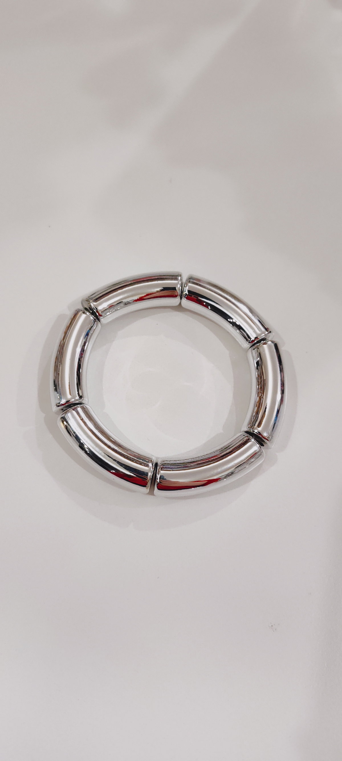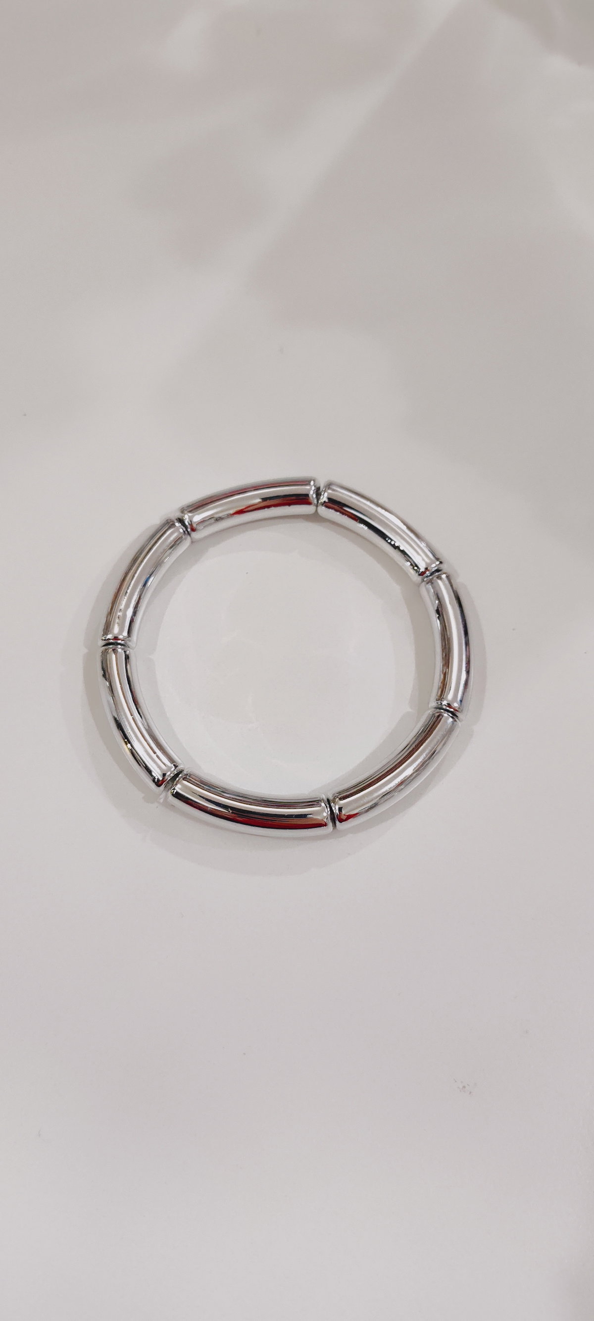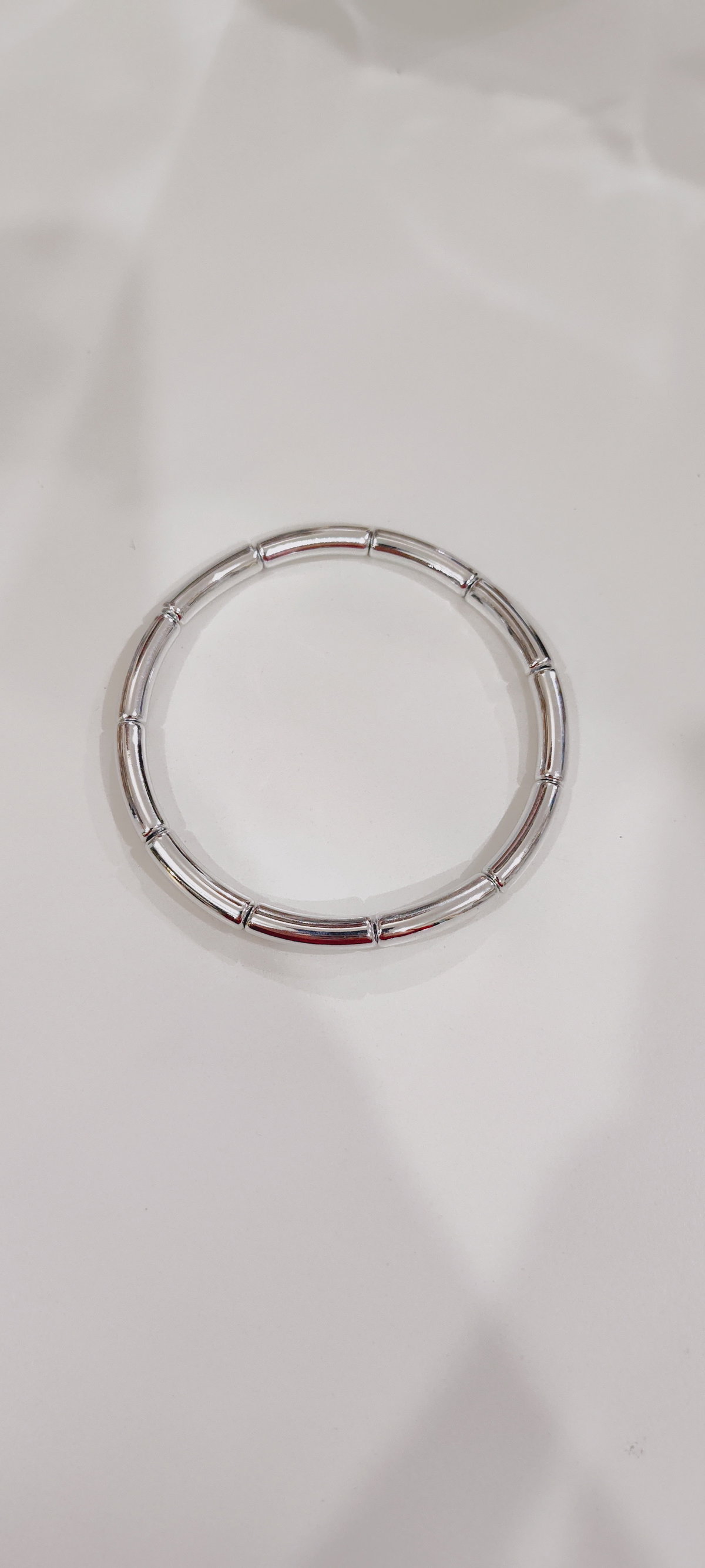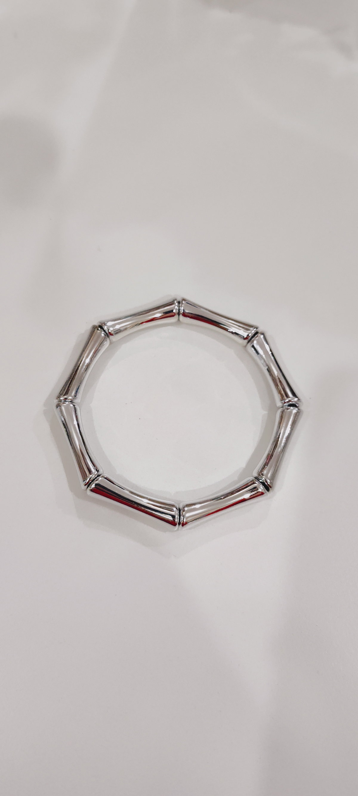 Pulsera rígida de eslabones rectangulares tipo bambú, en acabado plateado brillante. Diseño geométrico y delicado, ideal para un look moderno y minimal.