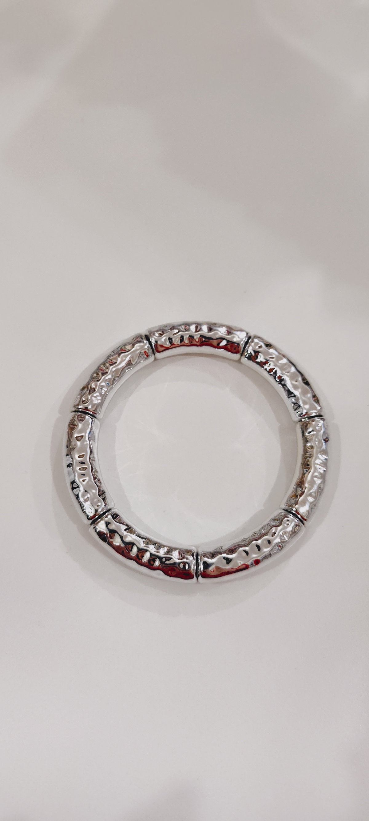 Pulsera rígida con segmentos irregulares y acabado martillado. Diseño moderno con efecto artesanal, única y llamativa.