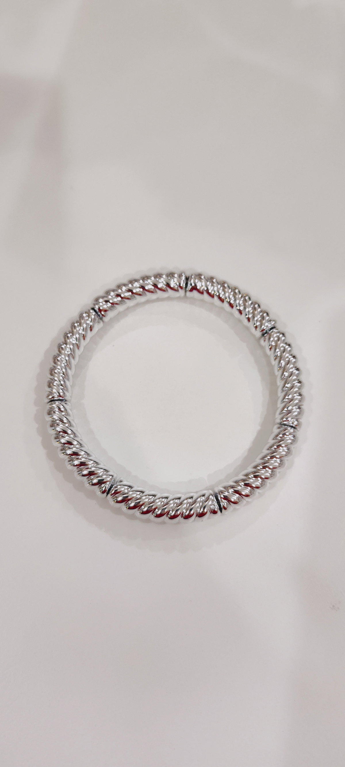 Pulsera rígida con diseño trenzado en relieve. Brillo intenso y textura protagonista, ideal para sumar un detalle sofisticado.