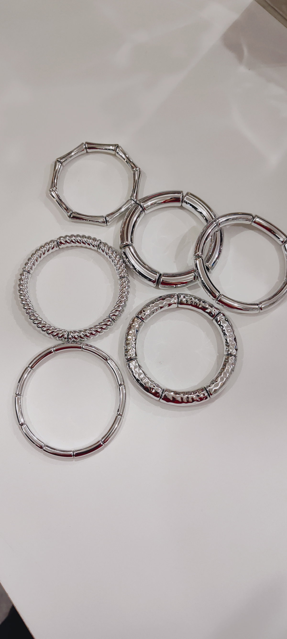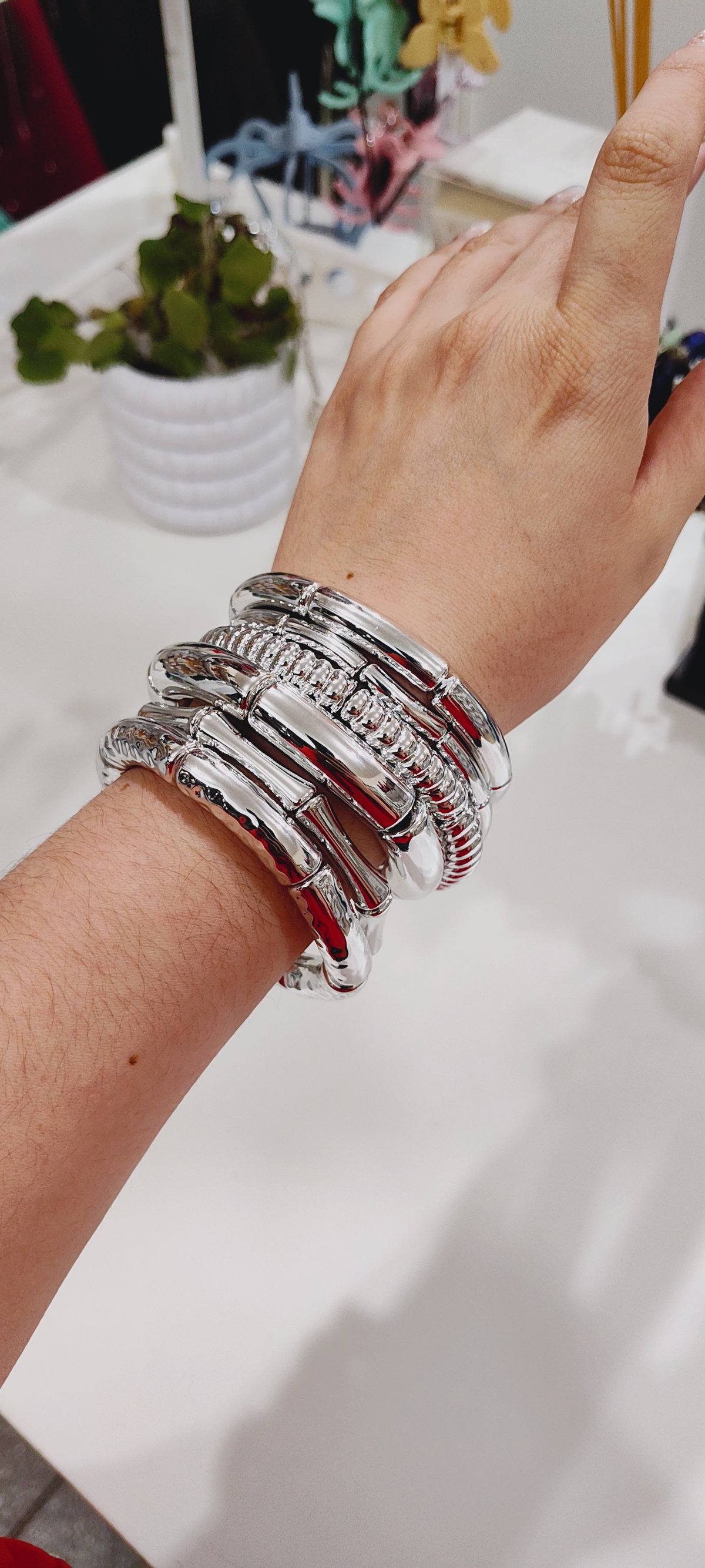 Pulseras rígidas plateadas con diseños modernos y versátiles, ideales para usar solas o combinadas y elevar cualquier look.