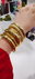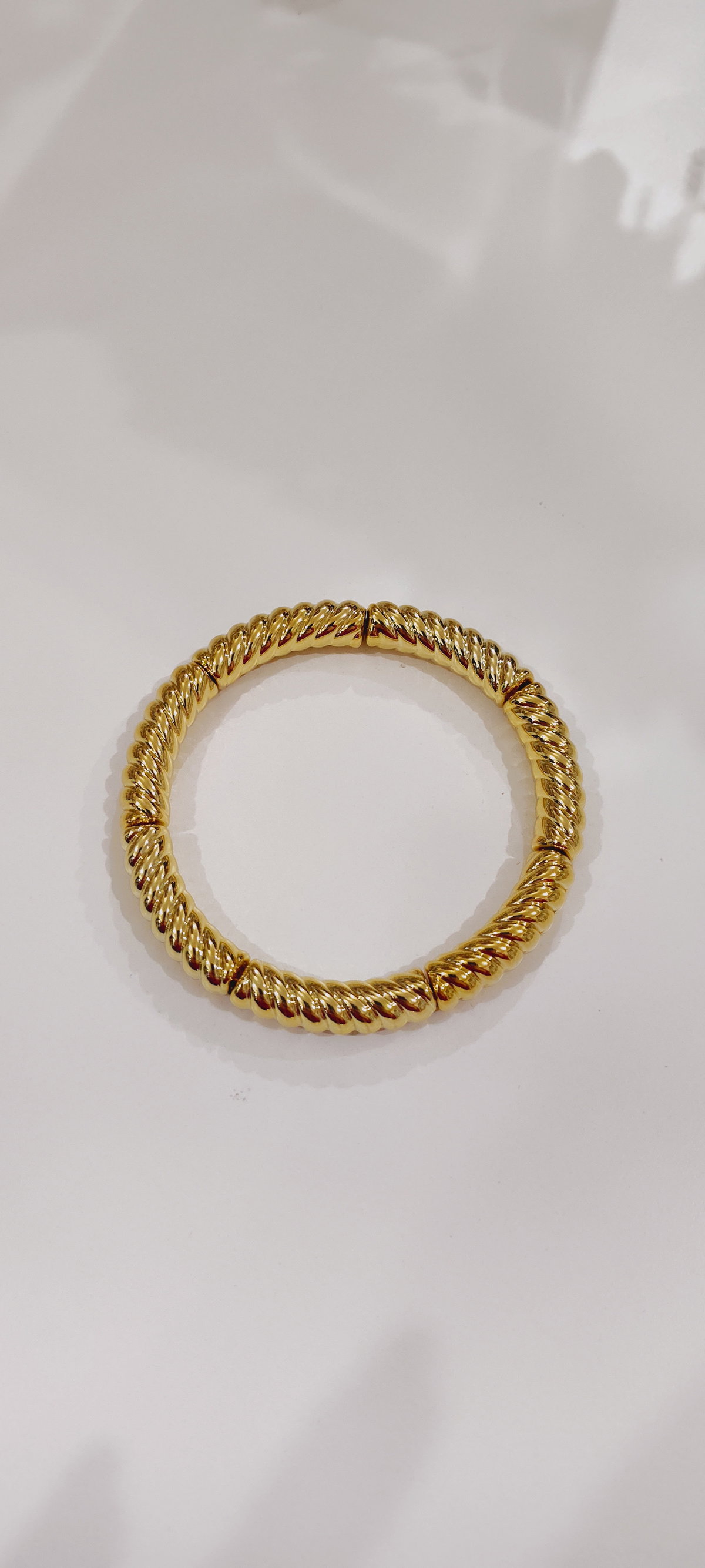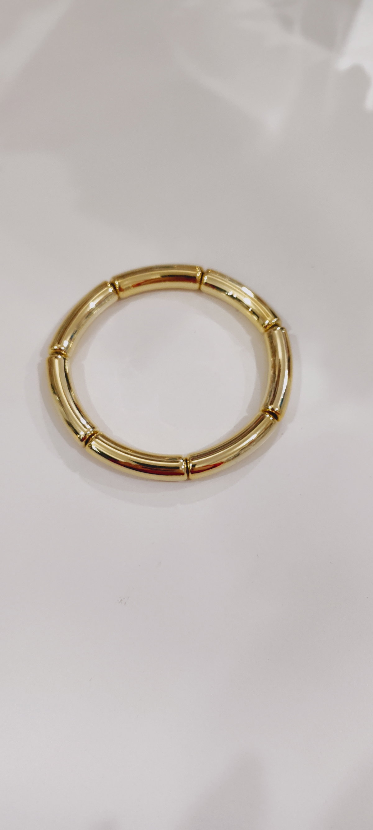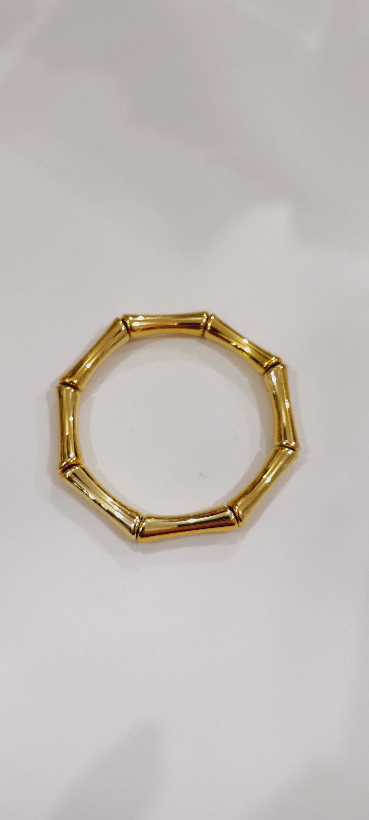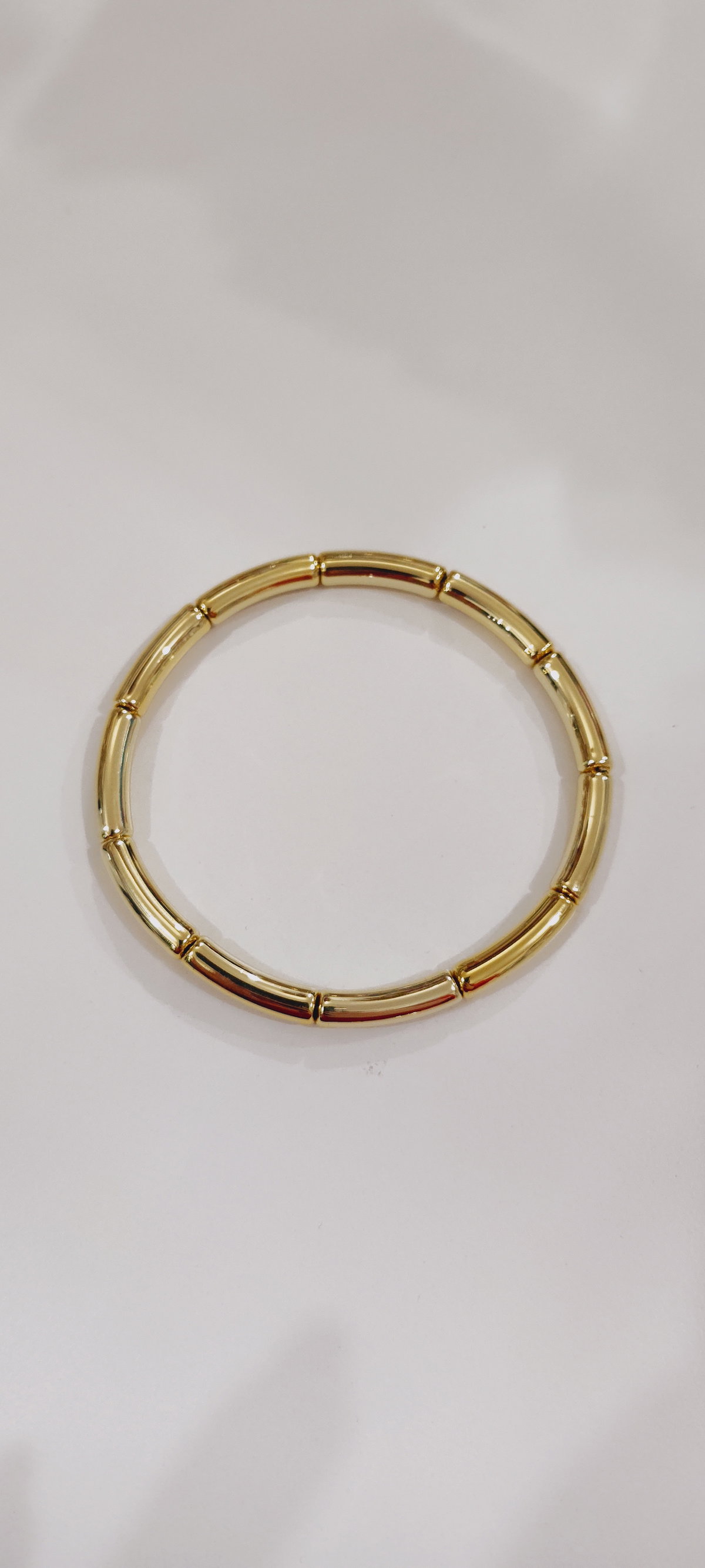 Pulsera rígida dorada de eslabones finos tipo bamboo. Liviana, delicada y fácil de combinar para uso diario.