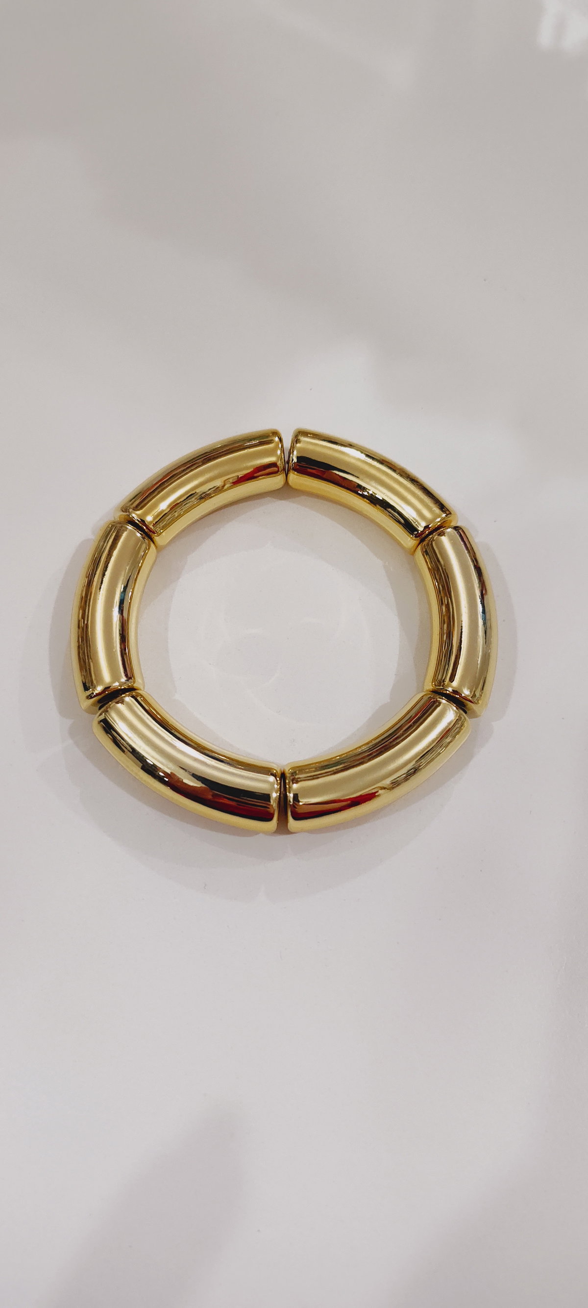 Pulsera rígida dorada de eslabones curvos tipo bamboo. Elegante y versátil, perfecta para usar sola o combinada.