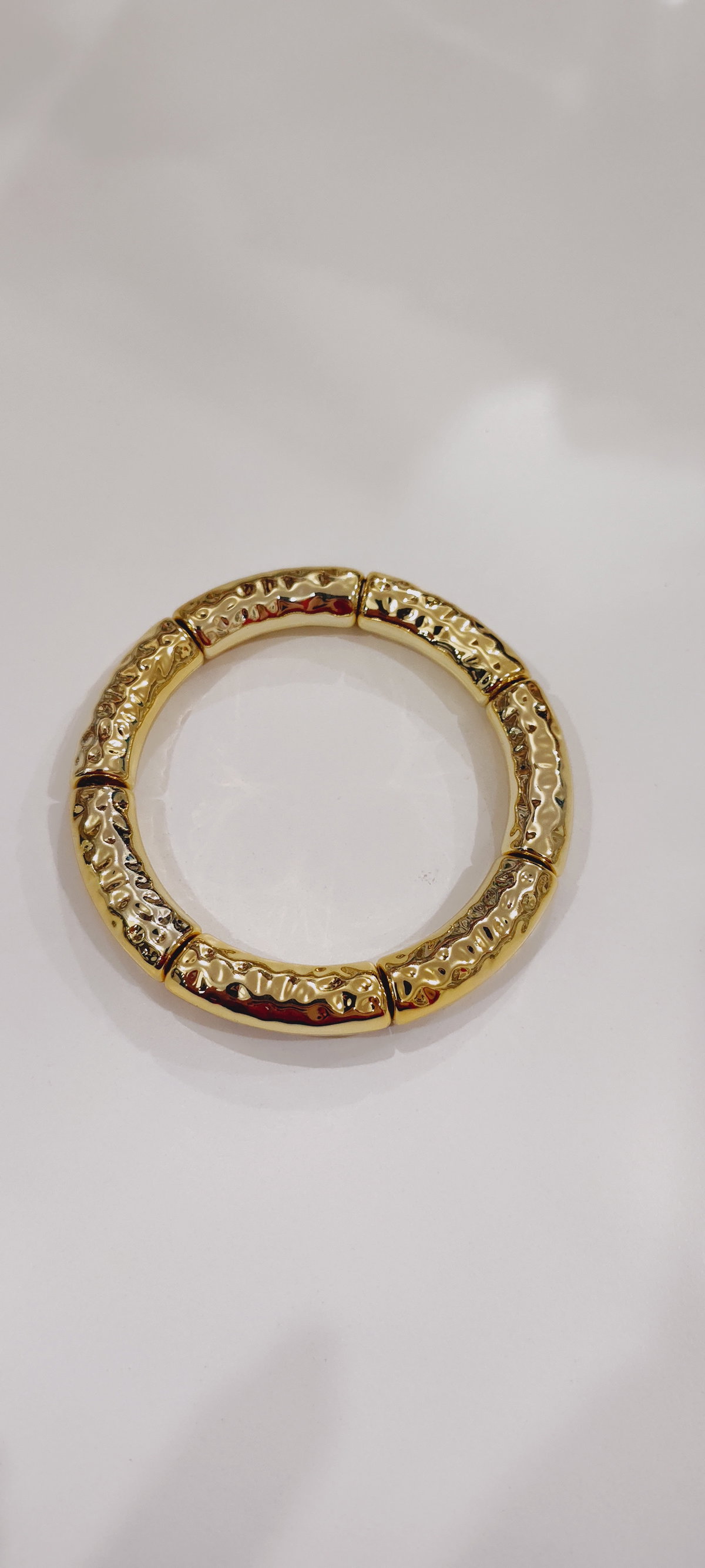 Pulsera rígida dorada con segmentos irregulares y acabado martillado. Moderna, original y llamativa.