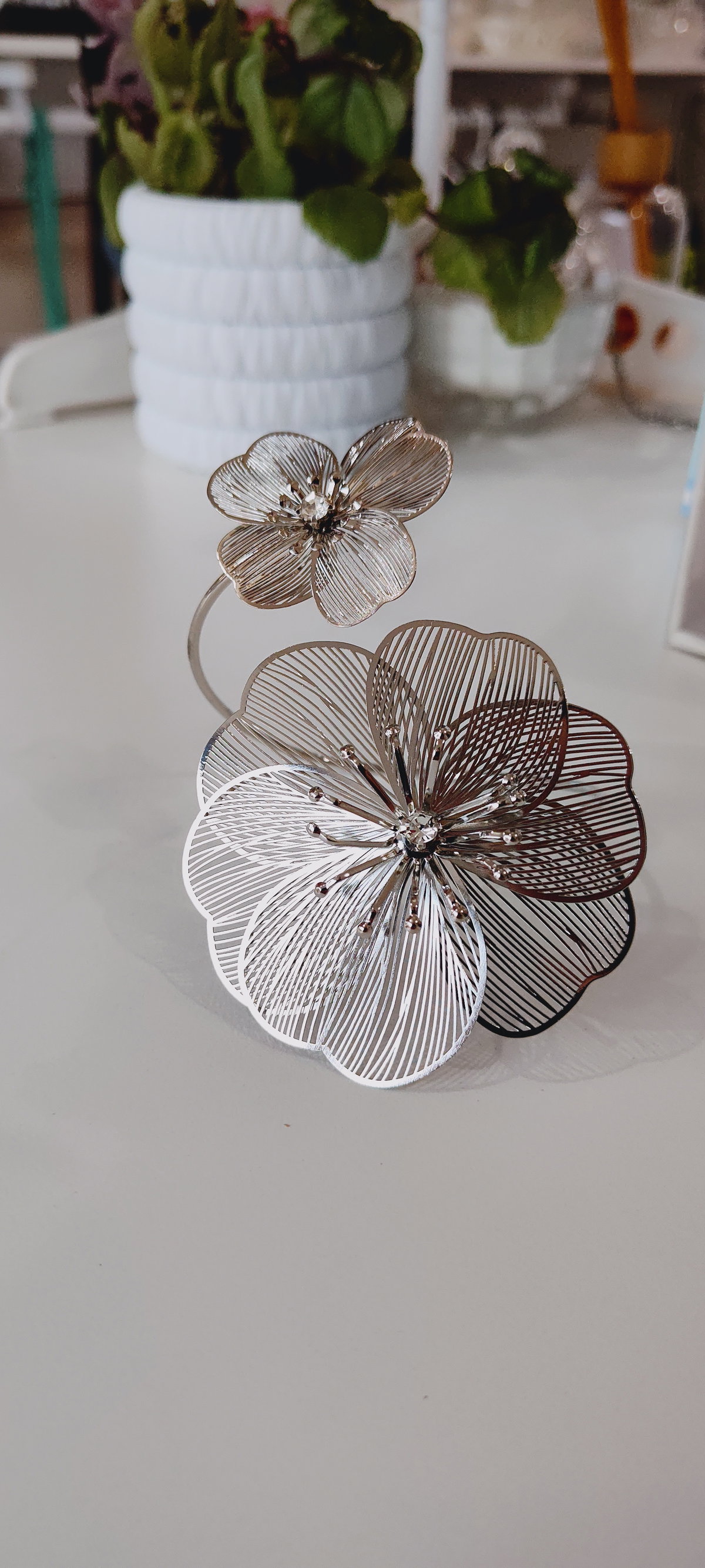 Su acabado plateado de alto brillo y su diseño de doble flor superpuesta te harán destacar en cualquier ocasión.