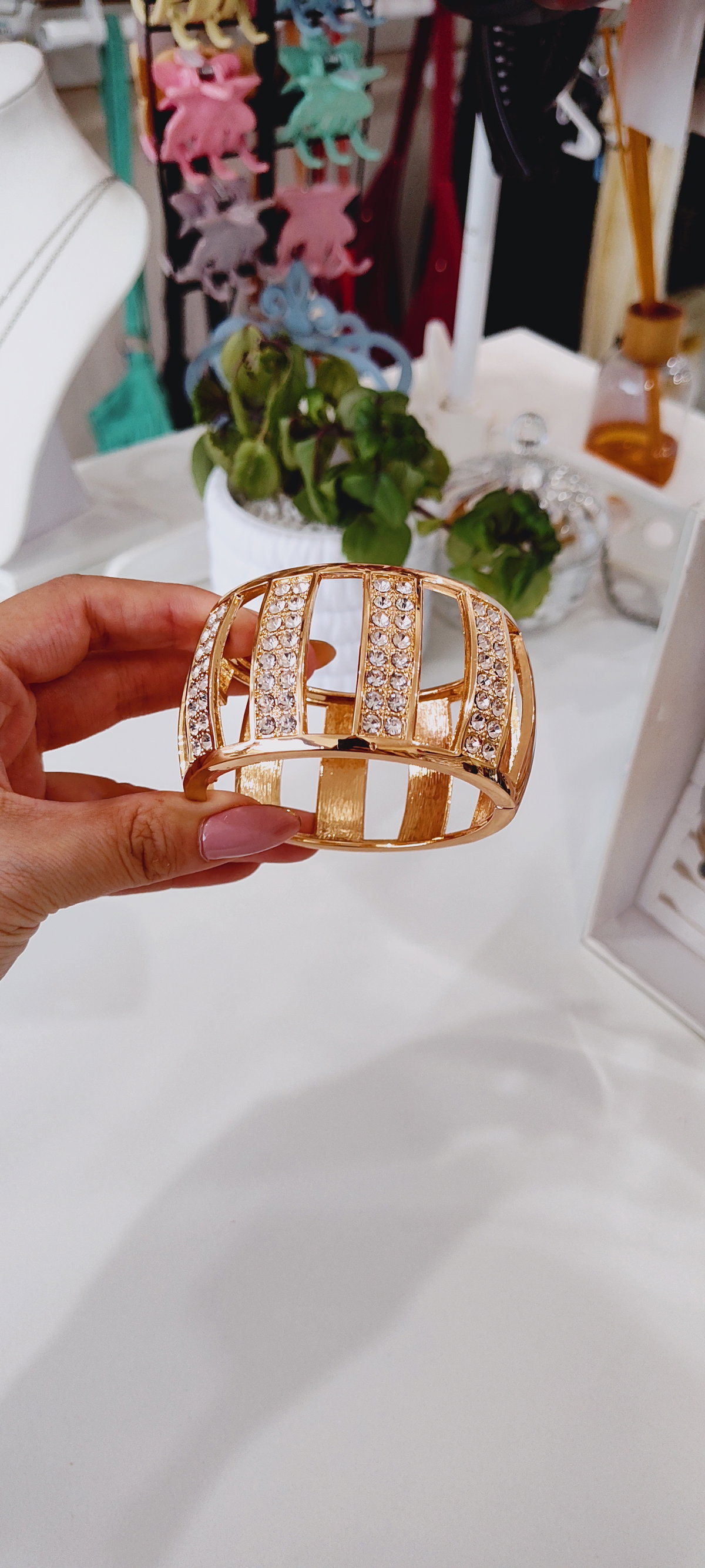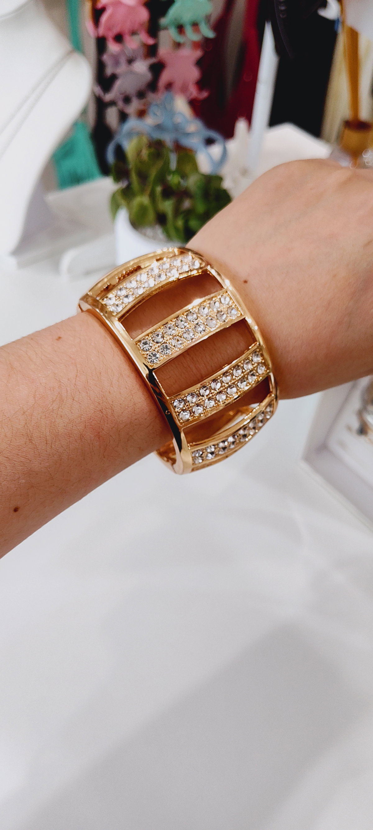 Este accesorio es brazalete o pulsera ancha rígida, ideal para añadir un toque de glamour a cualquier atuendo. Presenta un diseño moderno y calado con bandas horizontales, lo que le otorga un aspecto contemporáneo y ligero. Con un acabado brillante en tono dorado y está adornado con múltiples incrustaciones de strass o cristales transparentes que reflejan la luz intensamente.
