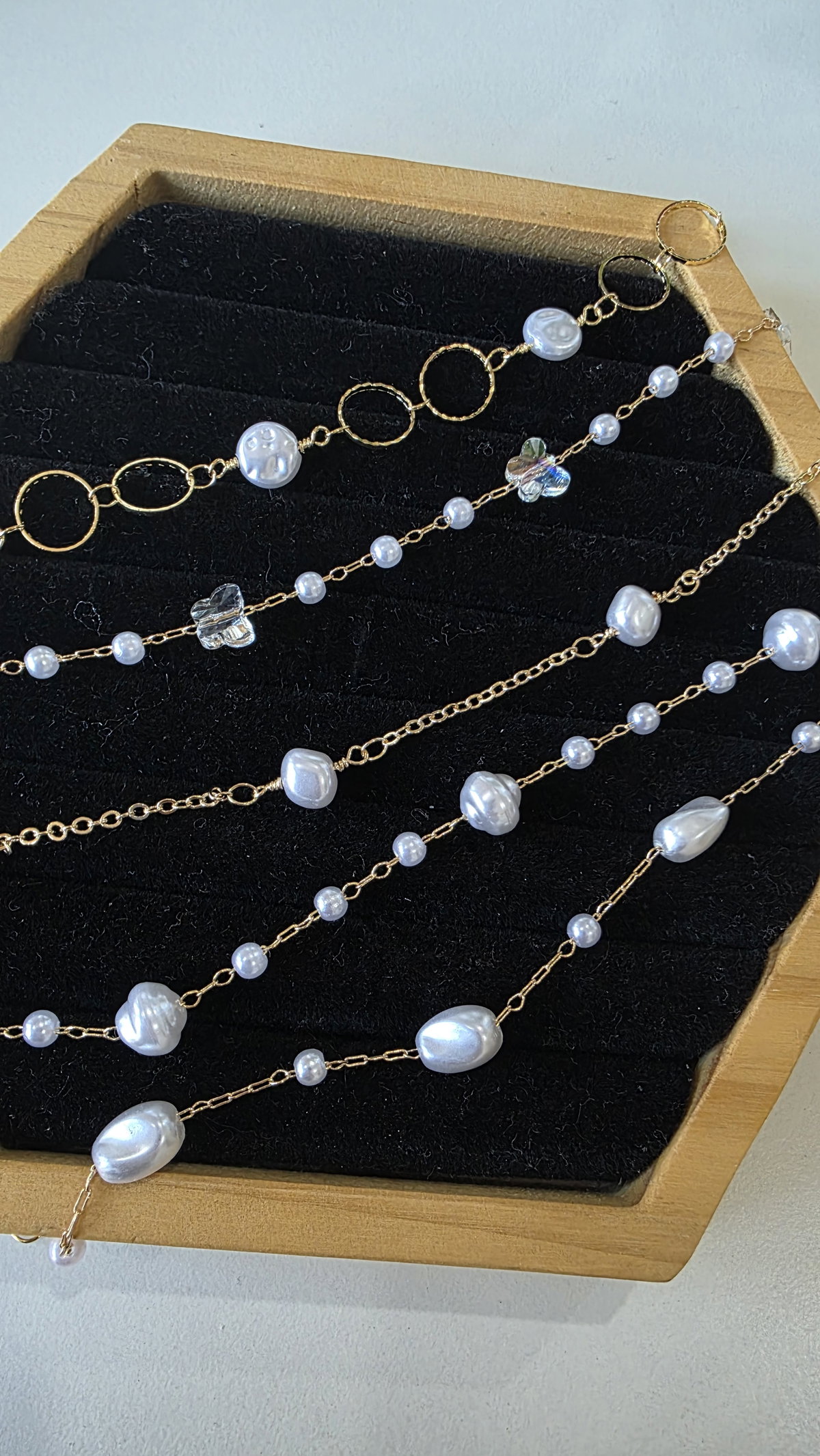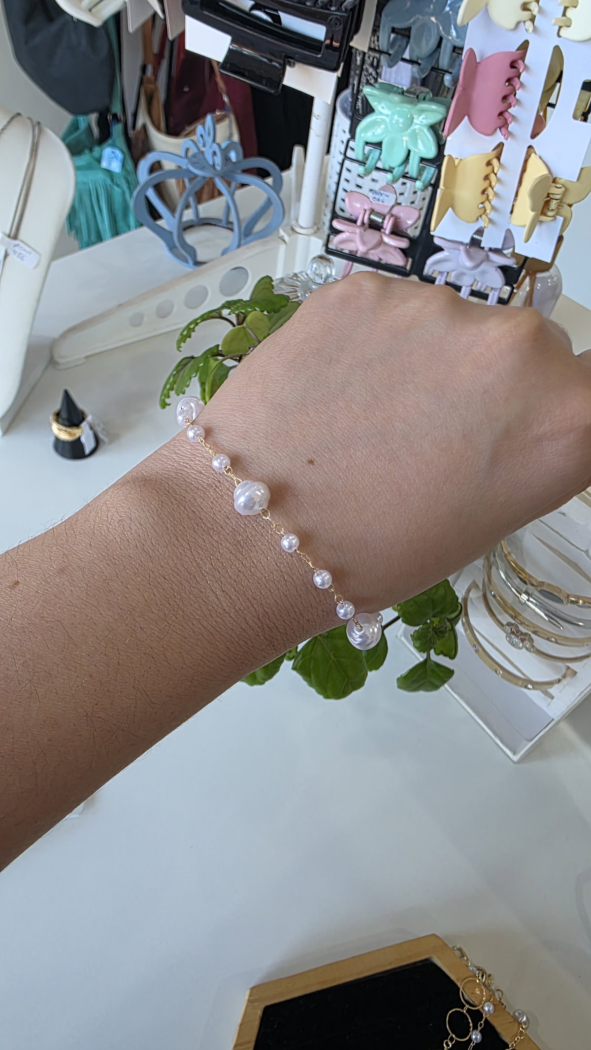 Pulsera con perlas irregulares y pequeñas perlas distribuidas de forma armoniosa. Aporta un estilo romántico y elegante.