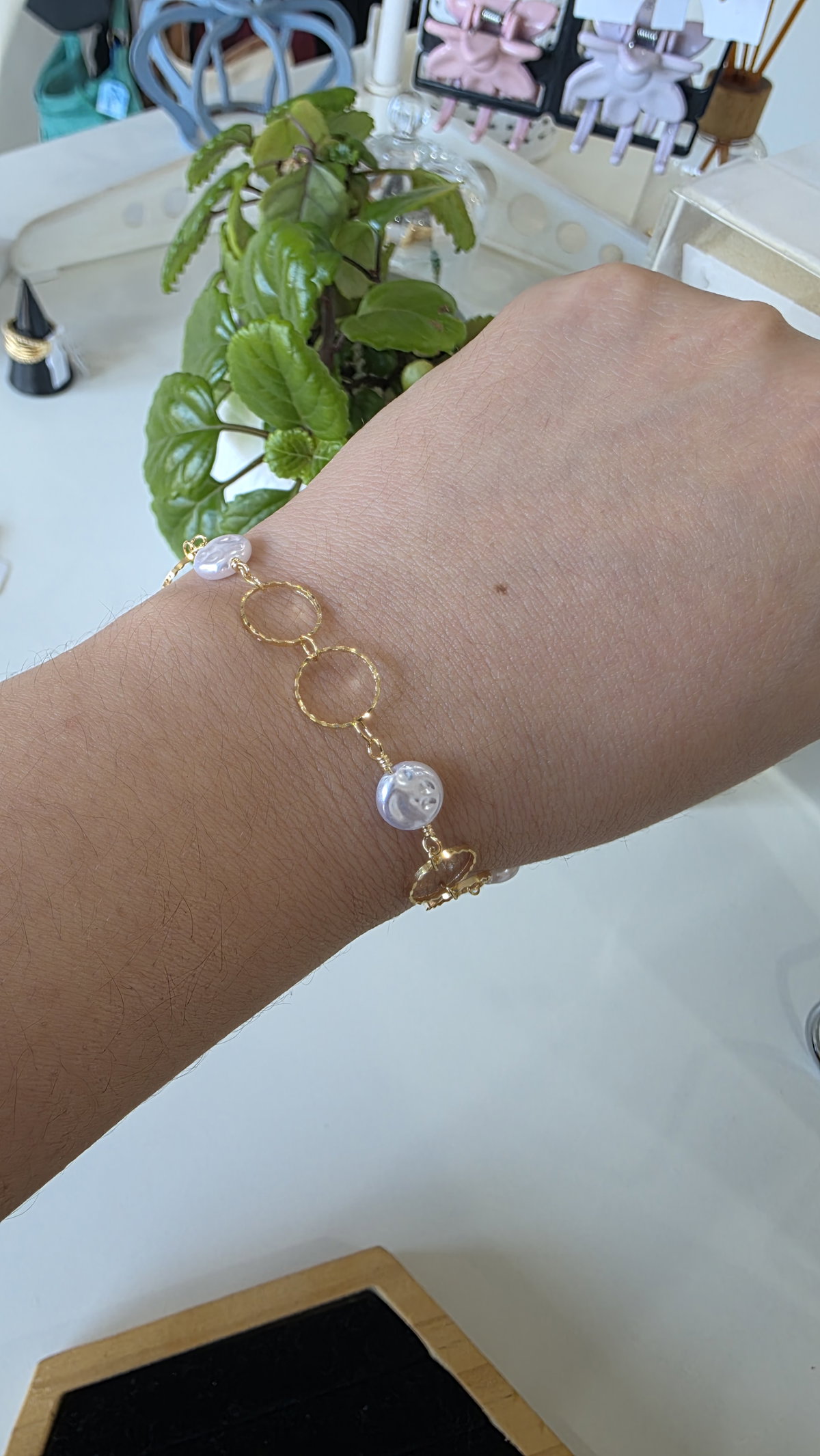 Pulsera dorada con eslabones circulares y perlas irregulares. Elegante y moderna, ideal para un look sofisticado.