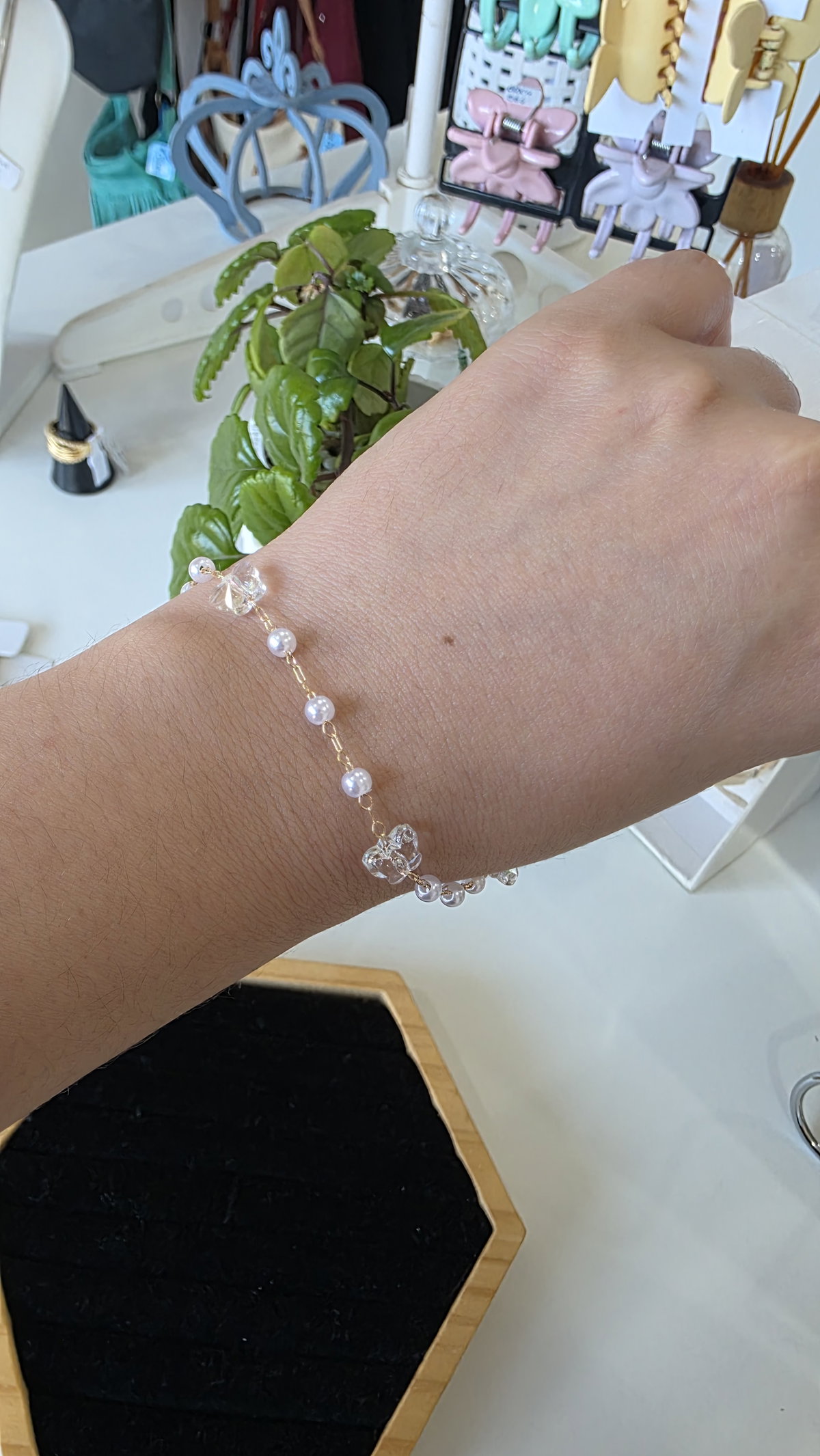 Pulsera fina con pequeñas perlas y dijes de mariposa transparentes. Delicada y femenina, perfecta para todos los días.