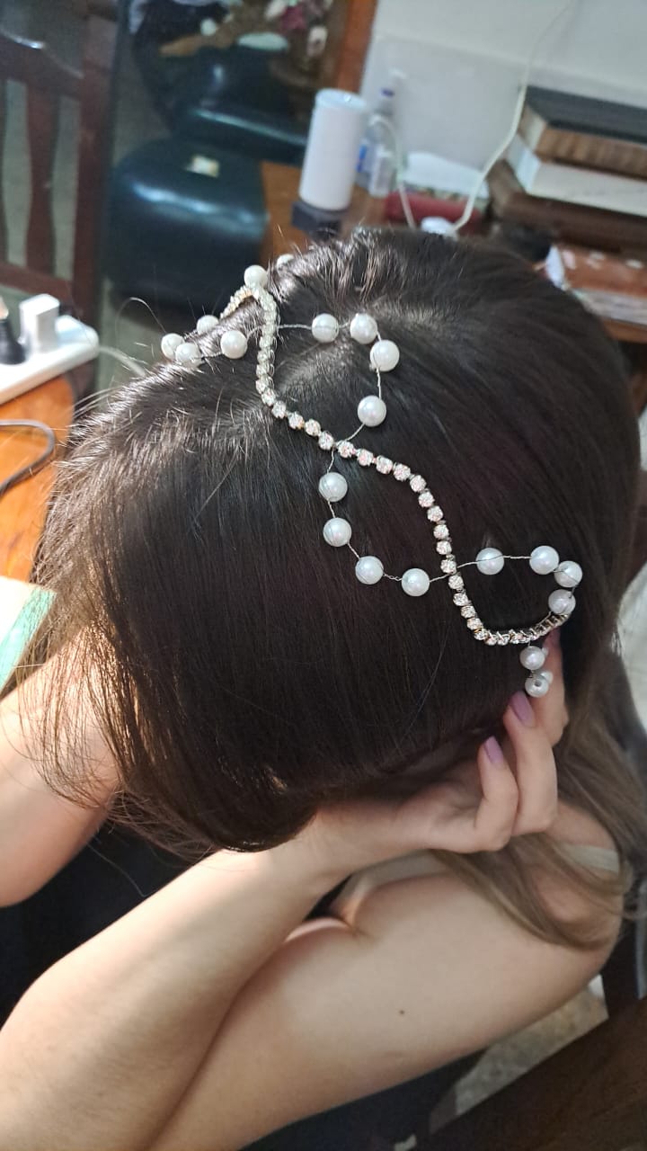 Tocado de perlas y strass en técnica de alambrismo
